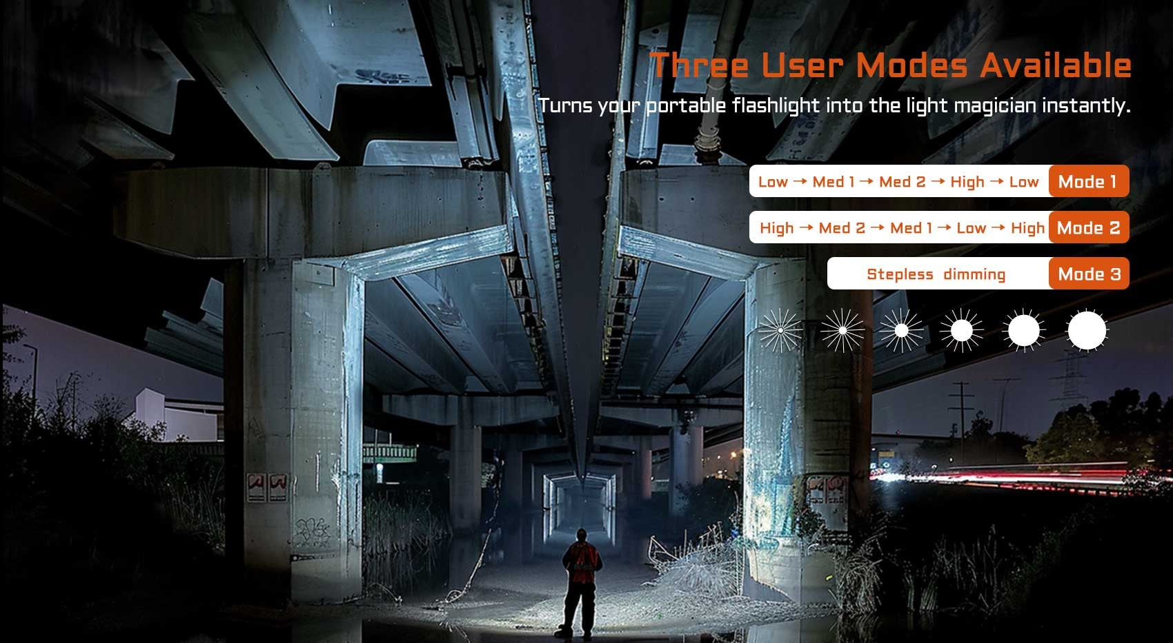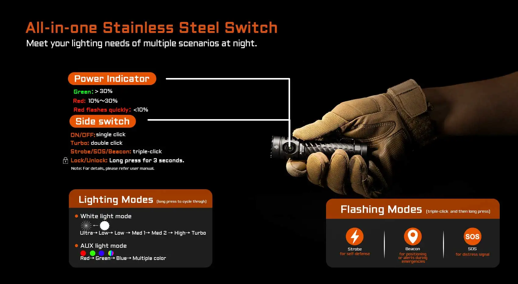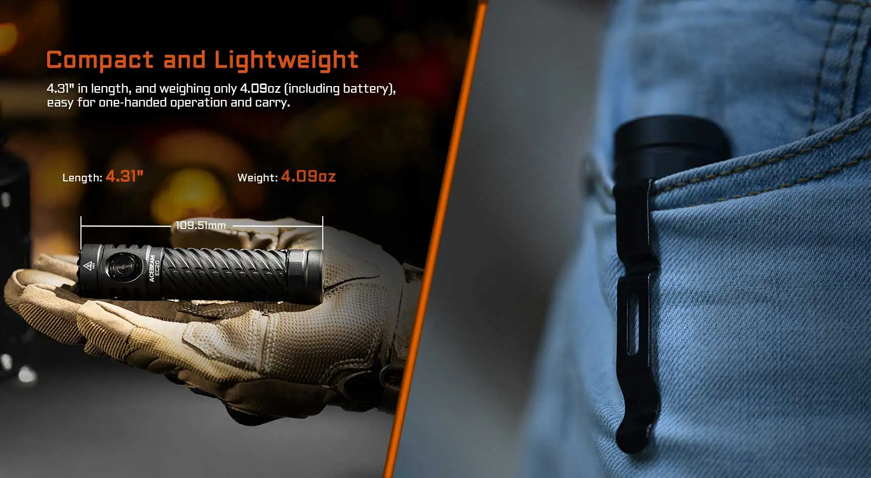 The EC20 is a finger-sized, portable EDC flashlight with a maximum output of 2800 lumens. It offers three premium LED options and excellent performance, powerful throw up to 370 meters. The AUX light excels in creating an ambiance for outdoor activities like camping. The dual fuel design supports rechargeable 18650 and CR123A batteries, catering to different power needs in various environments. The EC20 comes with a one-way clip and a magnetic tail cap, providing multiple carrying options. Additionally, the knurled milling pattern ensures a secure grip. Its battery level indicator displays the remaining power in real-time, giving you peace of mind during use.(15% sales on 11/12)