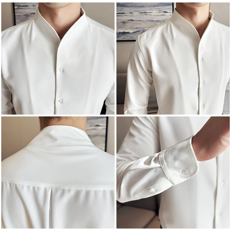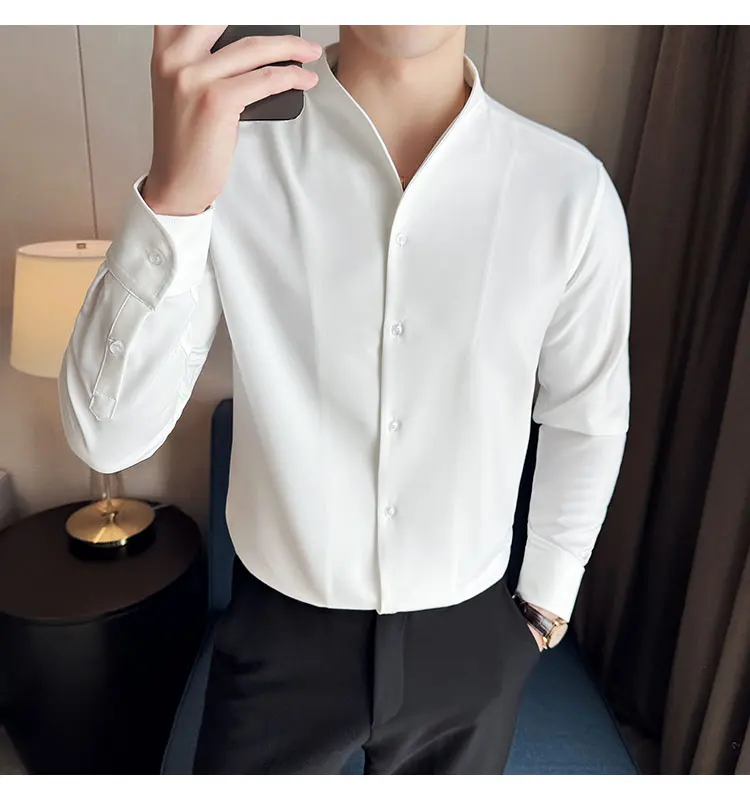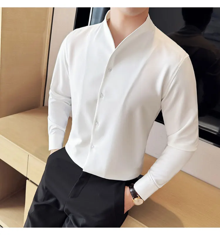 Advanced Sexy V-neck Men's Long Sleeved Shirt Designer Stand Up Collar Shirt Business Social Slim Fit Black and White Top