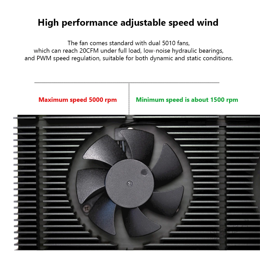 Silent Fan: Anodized black CNC machining, standard dual 6010 fan design, up to 20CFM under full load, low-noise hydraulic bearing, PWM speed regulation, suitable for both dynamic and static.
