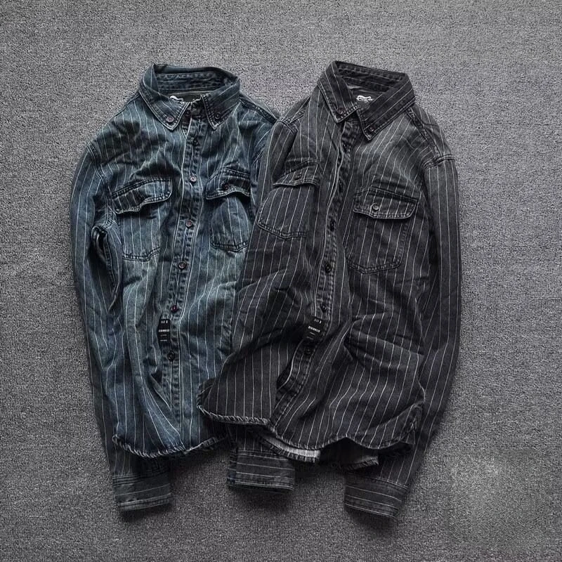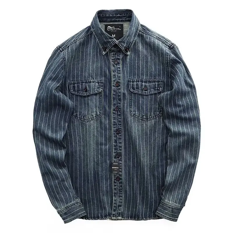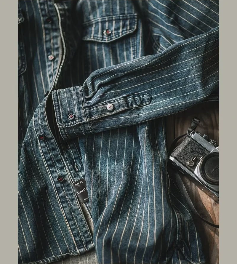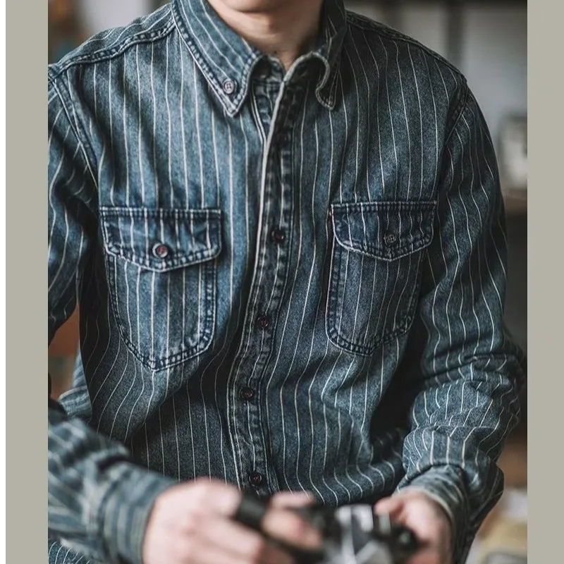 Amekaji Cargo Shirts Men's Vintage Vertical Stripe Denim Jackets Washed Distressed Pocket Trim Casual Coats Spring Autumn Shirts