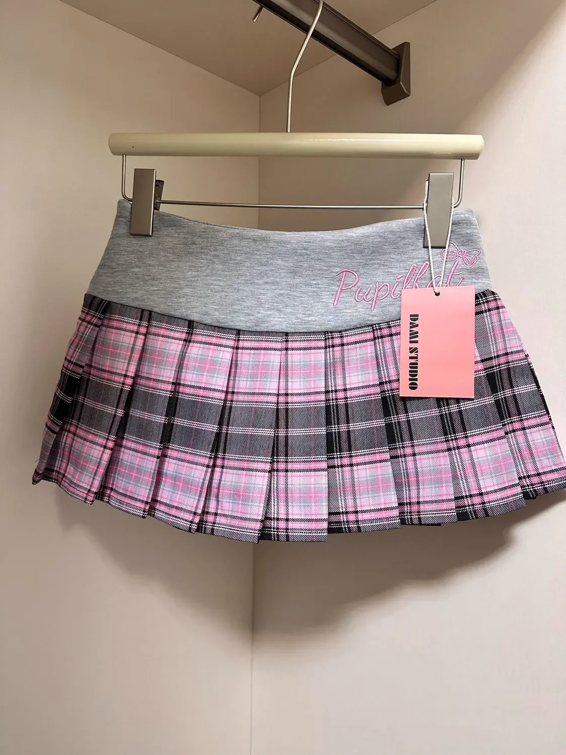 American Retro Spicy Girl Plaid Half Skirt Women Summer New Embroidery Patchwork Fashion High Waist Pleated Short Skirt