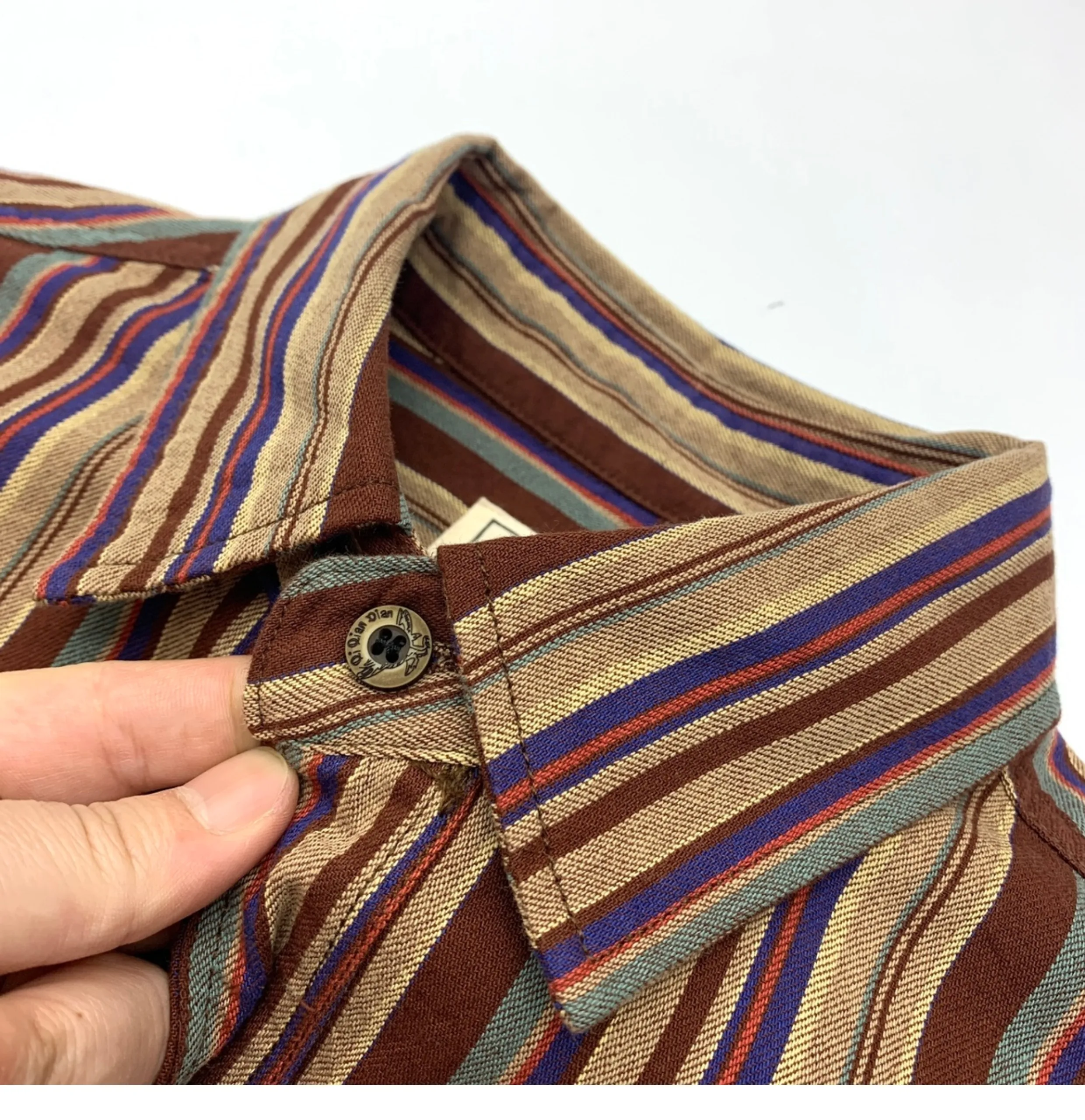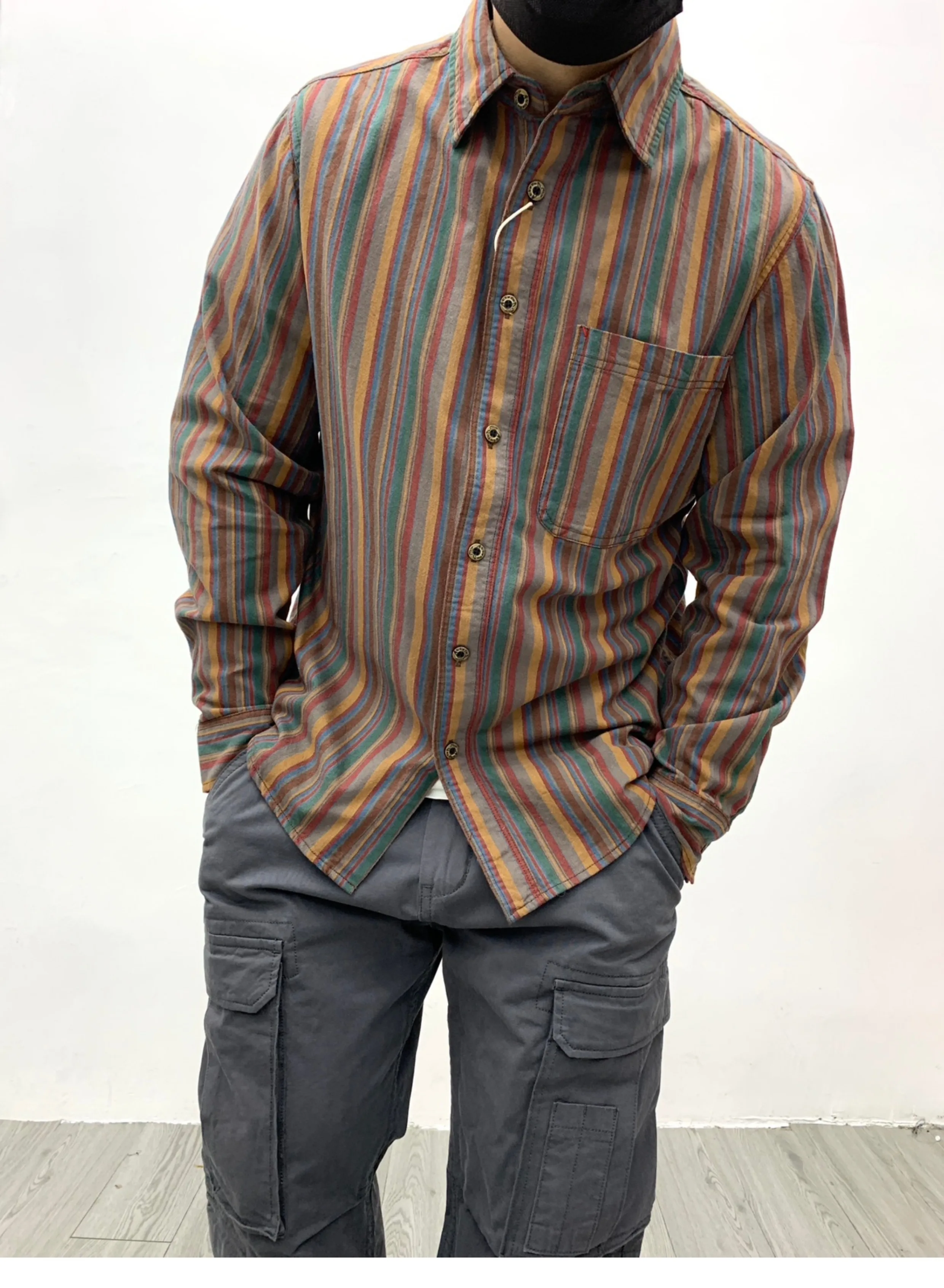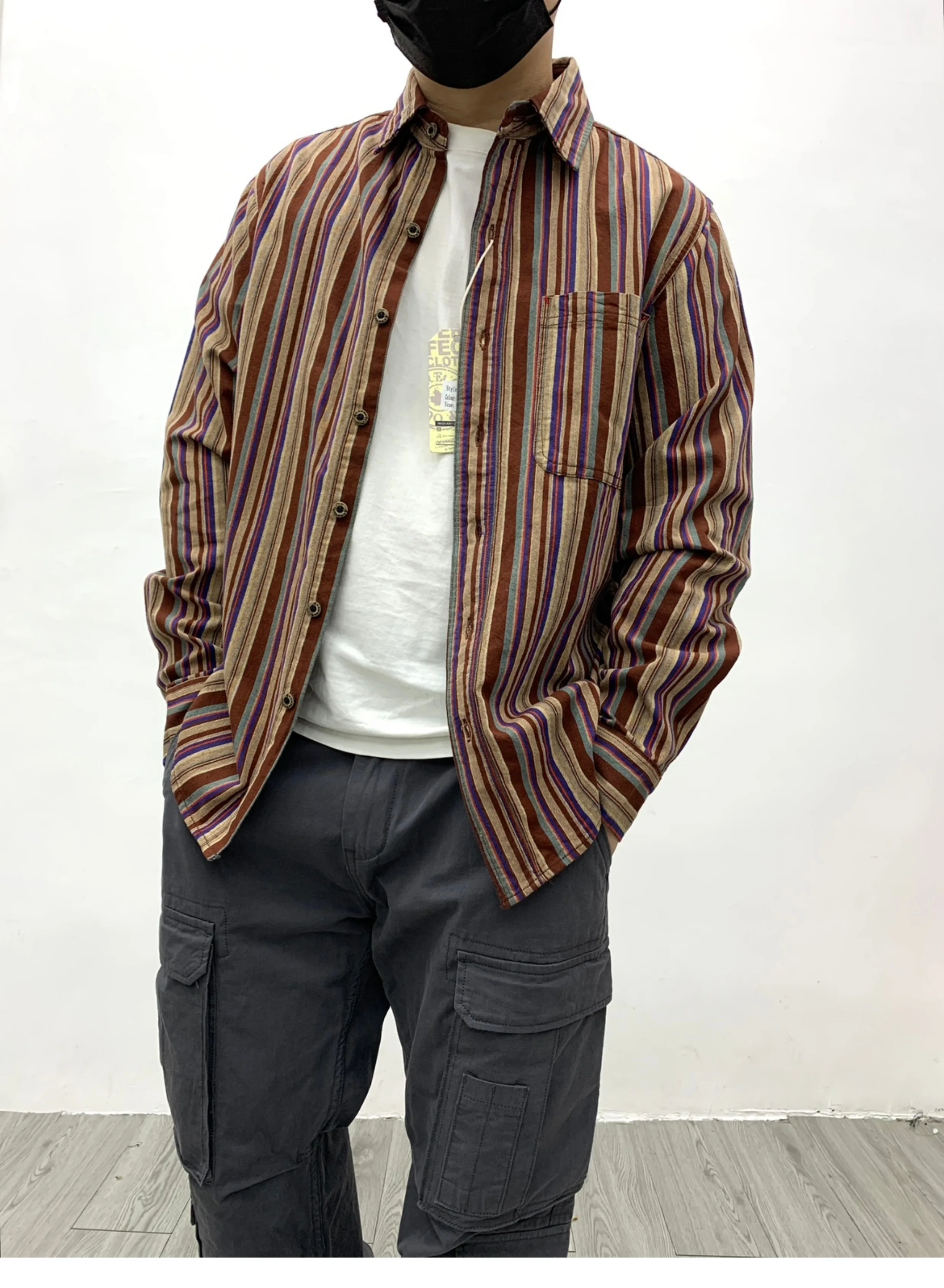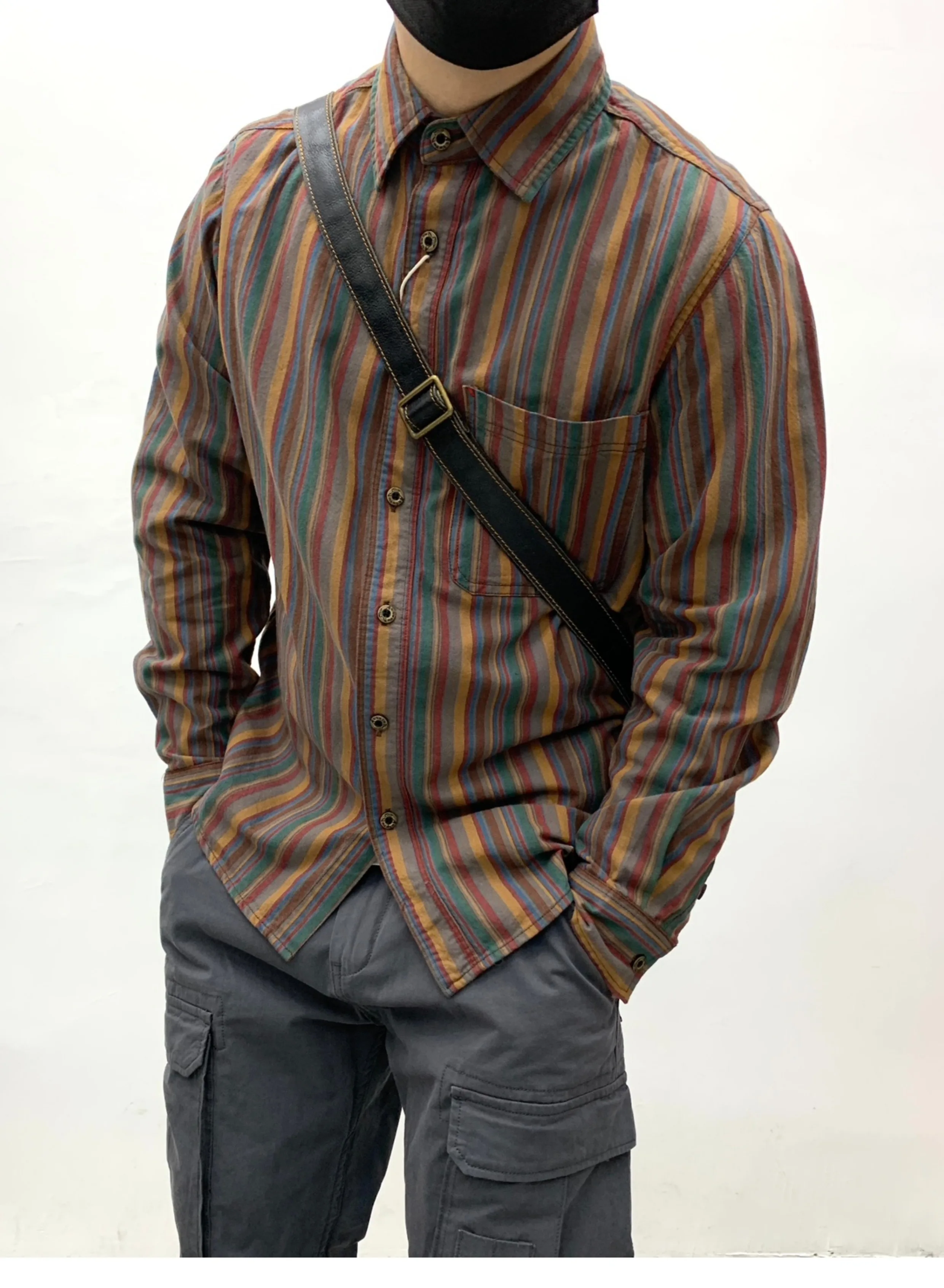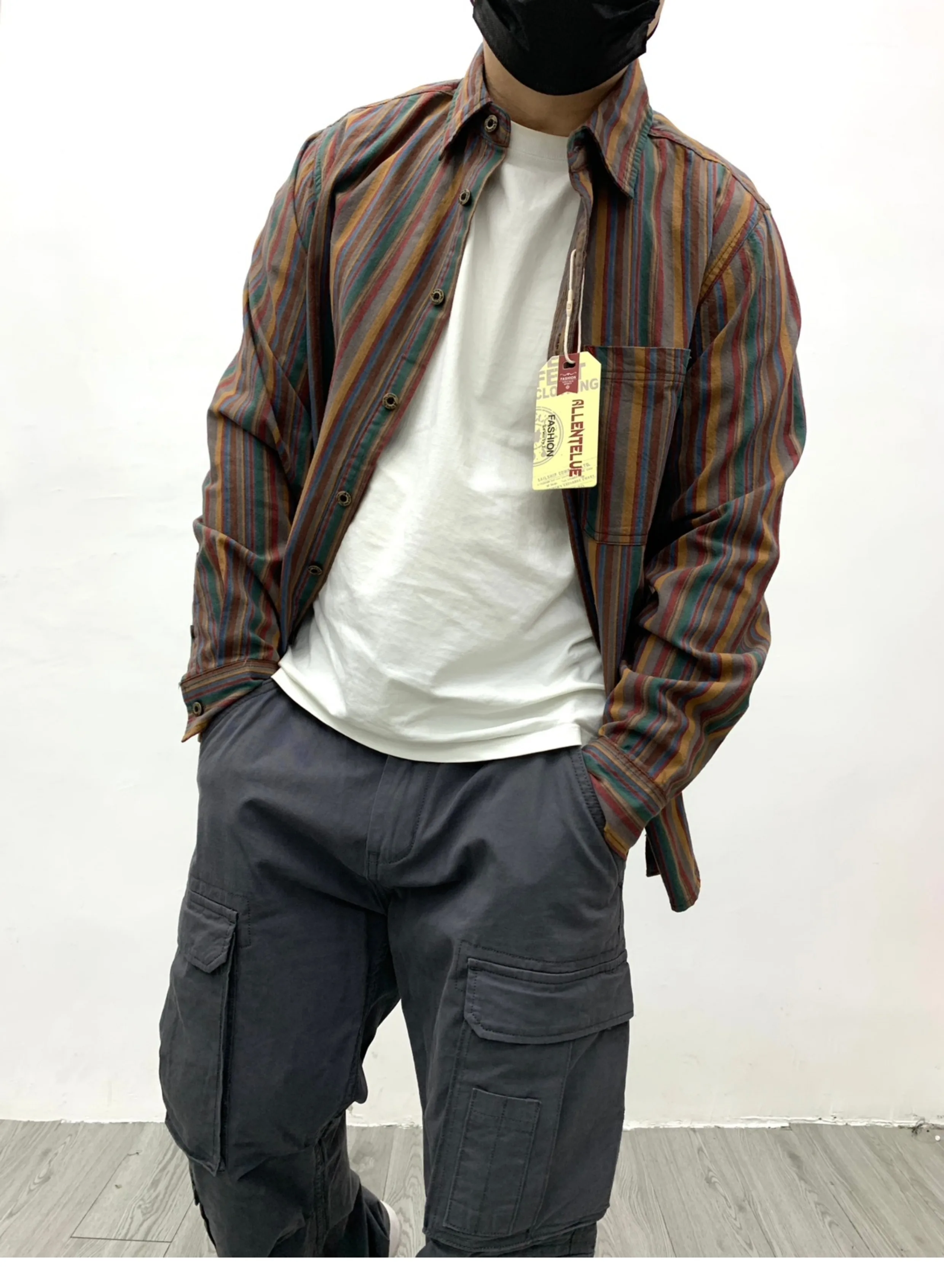 Amikaki Ethnic Style Men's Pure Cotton Colorful Stripes Shirt Loose Ancient Cargo Long Sleeved Shirt Jacket With Chest Pocket