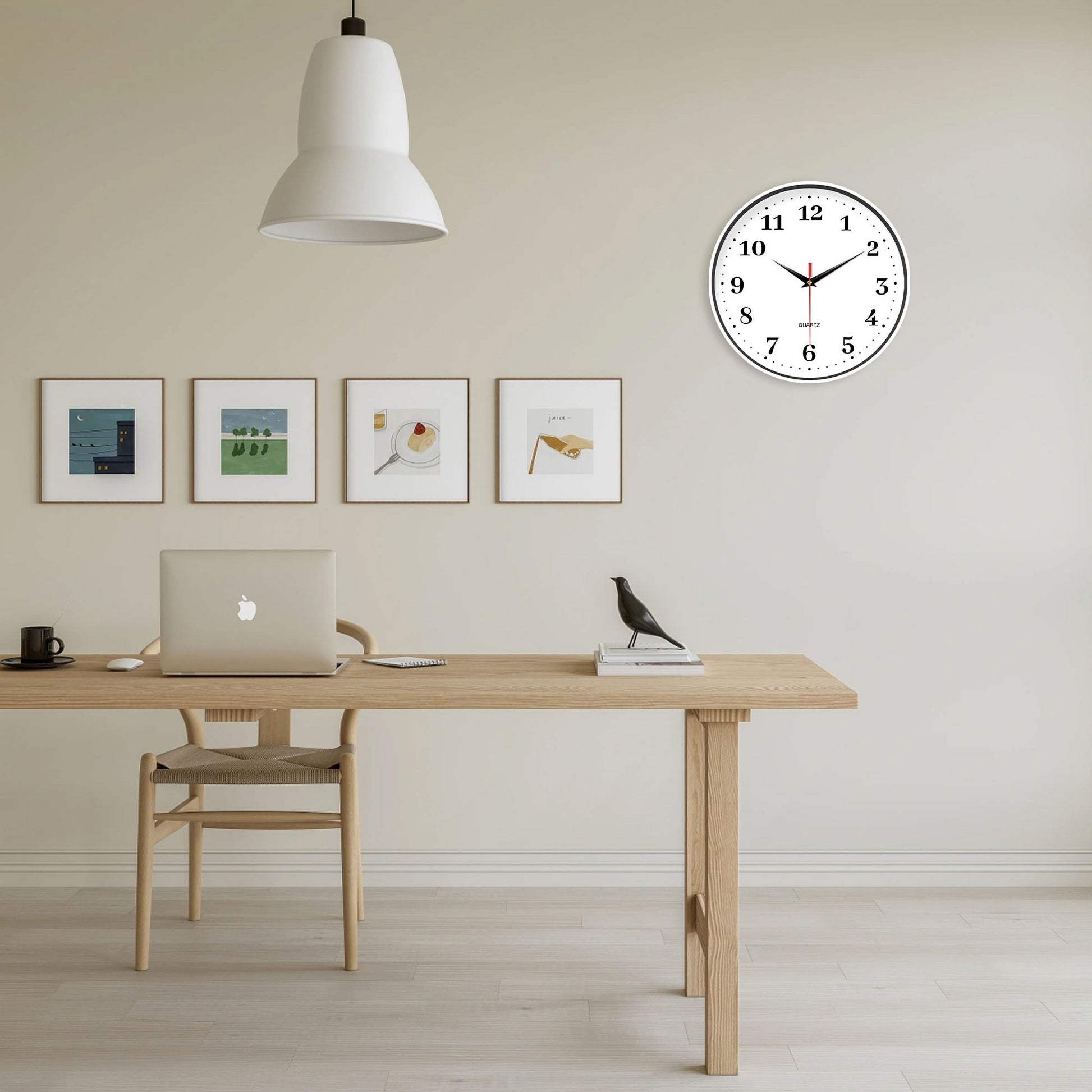 An 8-inch silent wall clock, modern white wall clock with simple design, battery operated quartz clock, adorns the family living