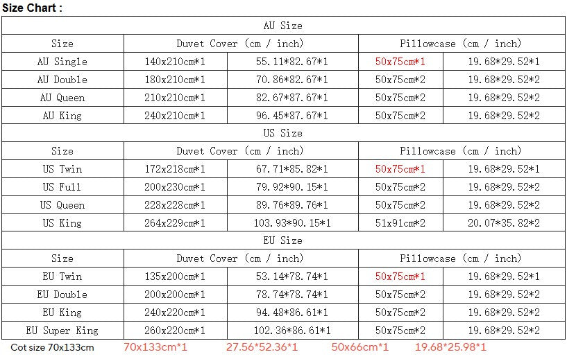 9. Package: US Twin/EU Single/AU Single are 2pcs/set (1x Duvet cover, 1x pillowcase), other sizes are 3pcs/set (1x Duvet cover, 2x pillowcase)