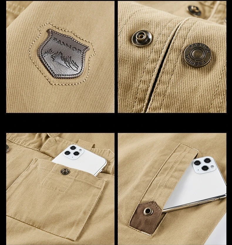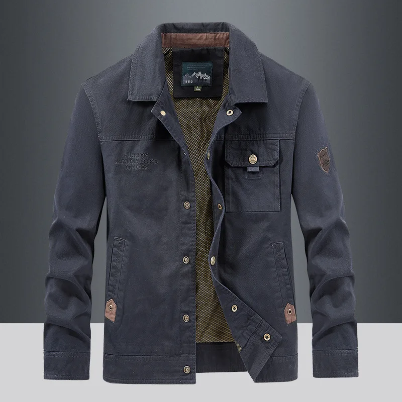Autumn Khaki Men's Collared Long-Sleeve Jacket, Army Green Casual Outerwear, Navy Blue Loose-Fit Top Coat.