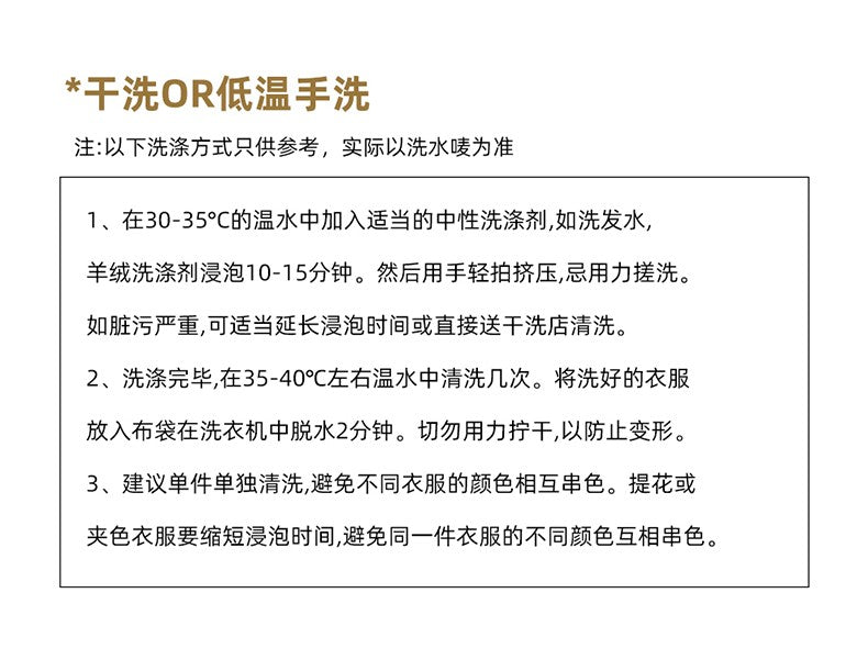 1. Add Appropriate Neutral Detergent, Such as Shampoo and Cashmere Detergent, to Warm Water at 30-35 ? for 10-15 Minutes. Then Pat and Squeeze with Your Hands, and Do Not Scrub with Force. If the Dirt Is Serious, the Soaking Time Can Be Extended Appropriately Or Directly Sent to the Dry Cleaner for Cleaning.