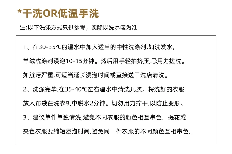 1. Add Appropriate Neutral Detergent, Such as Shampoo and Cashmere Detergent, to Warm Water at 30-35 ? for 10-15 Minutes. Then Pat and Squeeze with Your Hands, and Do Not Scrub with Force. If the Dirt Is Serious, the Soaking Time Can Be Extended Appropriately Or Directly Sent to the Dry Cleaner for Cleaning.
