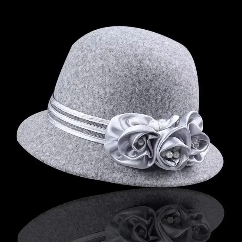 Autumn Winter NEW Wool Formal Hat Women’s Hat Church Hat Fisherman Hat Rose Blossoms Pearl Elegant Fashion Versatile