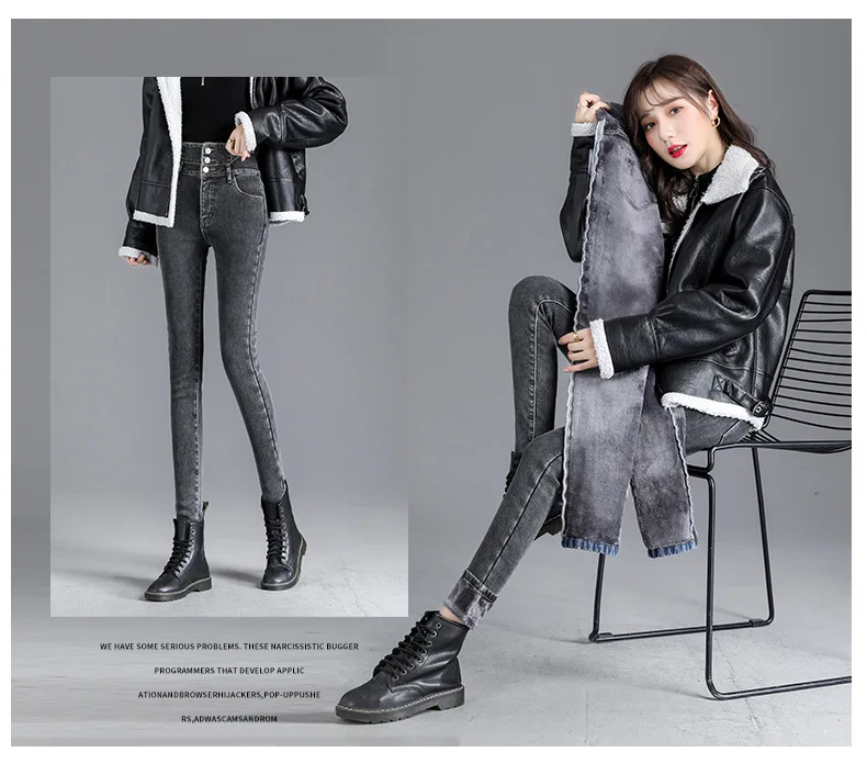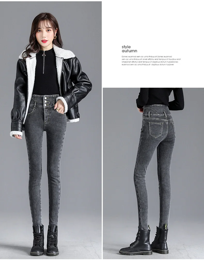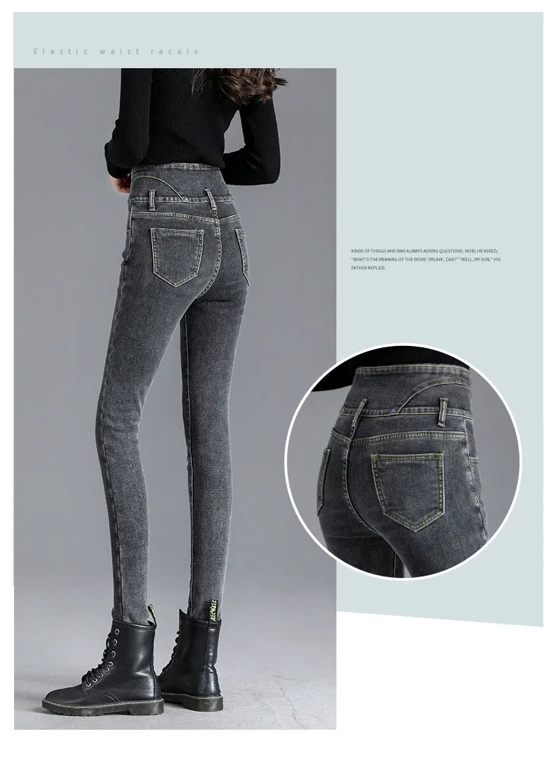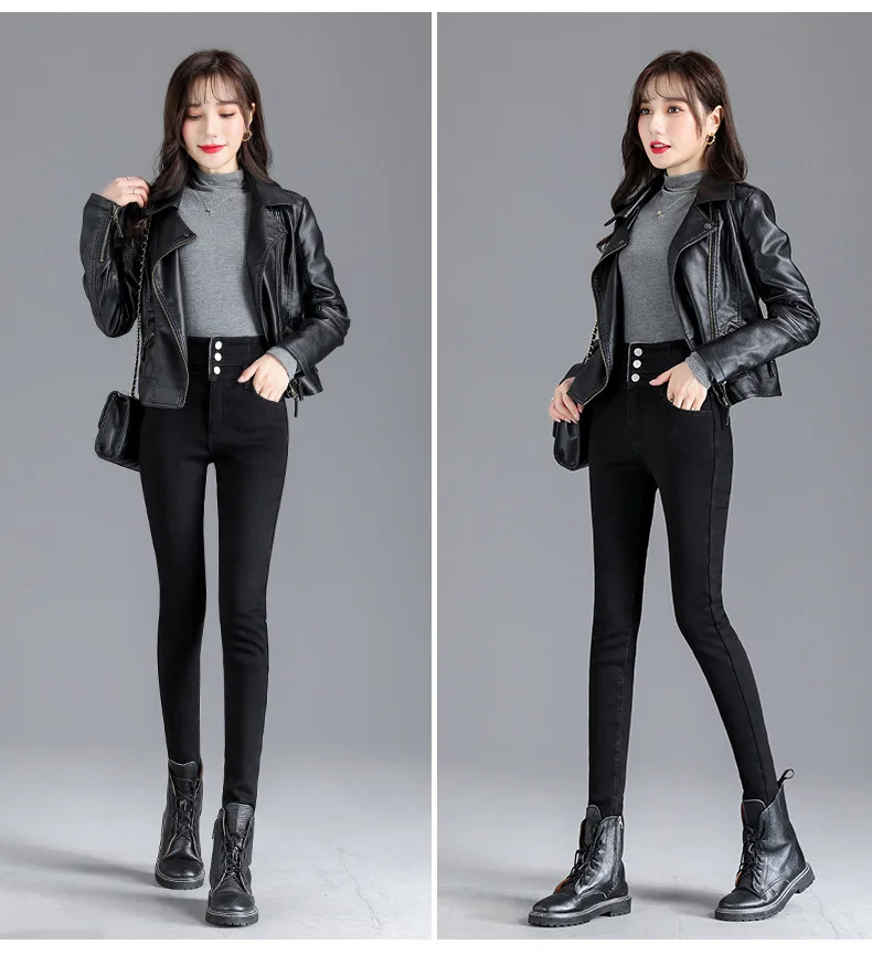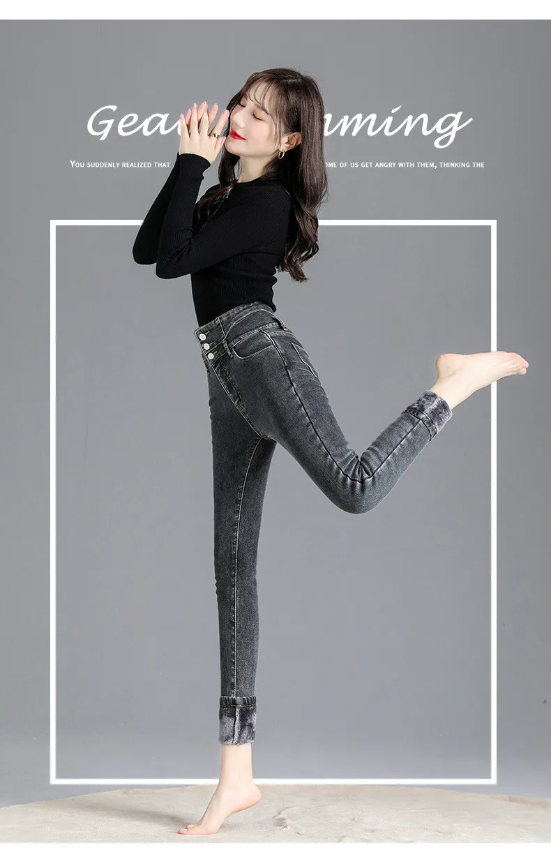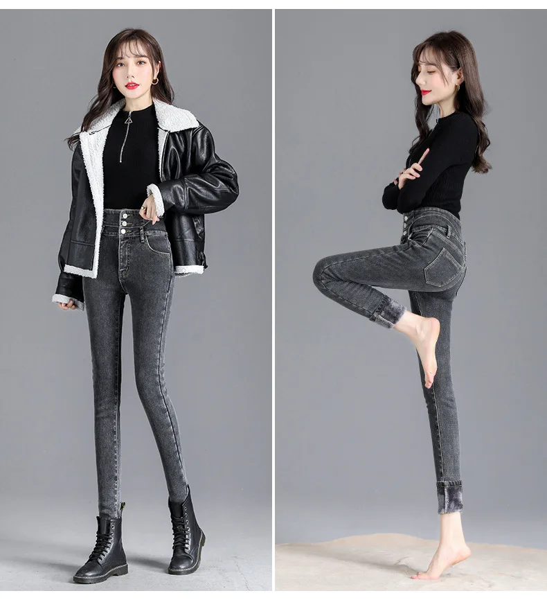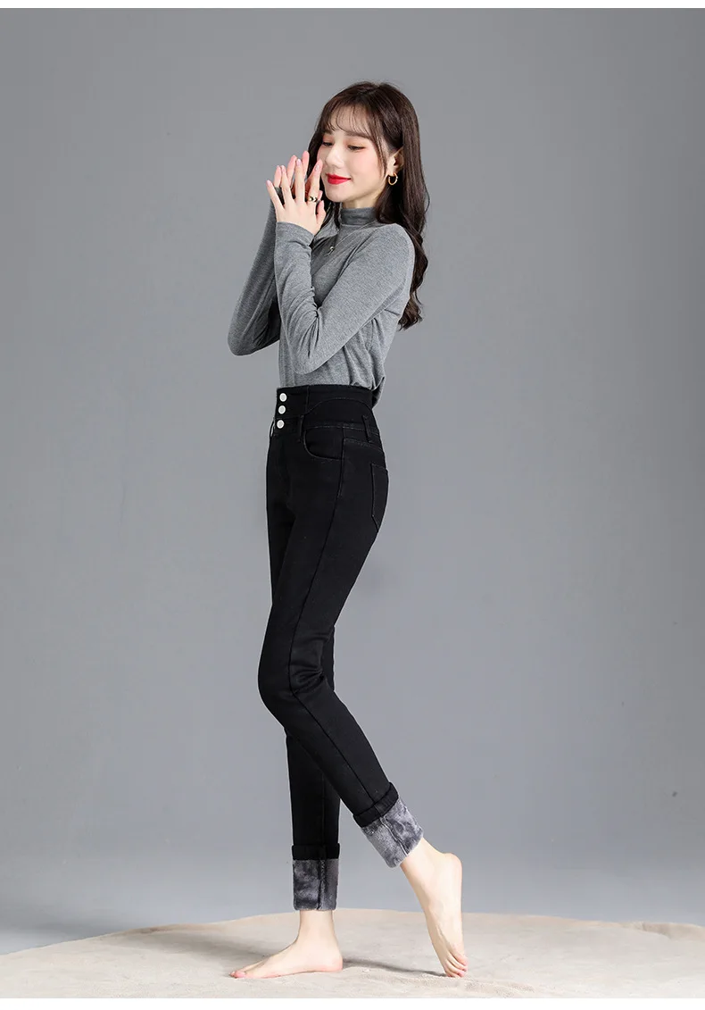 Autumn Winter Skinny Jeans Fashion Women Thermal Fleece High Waist Stretch Warm Pencil Pants Casual Velvet Button Denim Pant