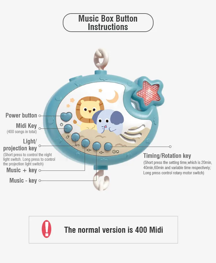 3. Timing function: the timer is 20/40/60 minutes and the music box will turn off automatically at the set time. The synchronization function creates an ideal sleeping environment for your baby.