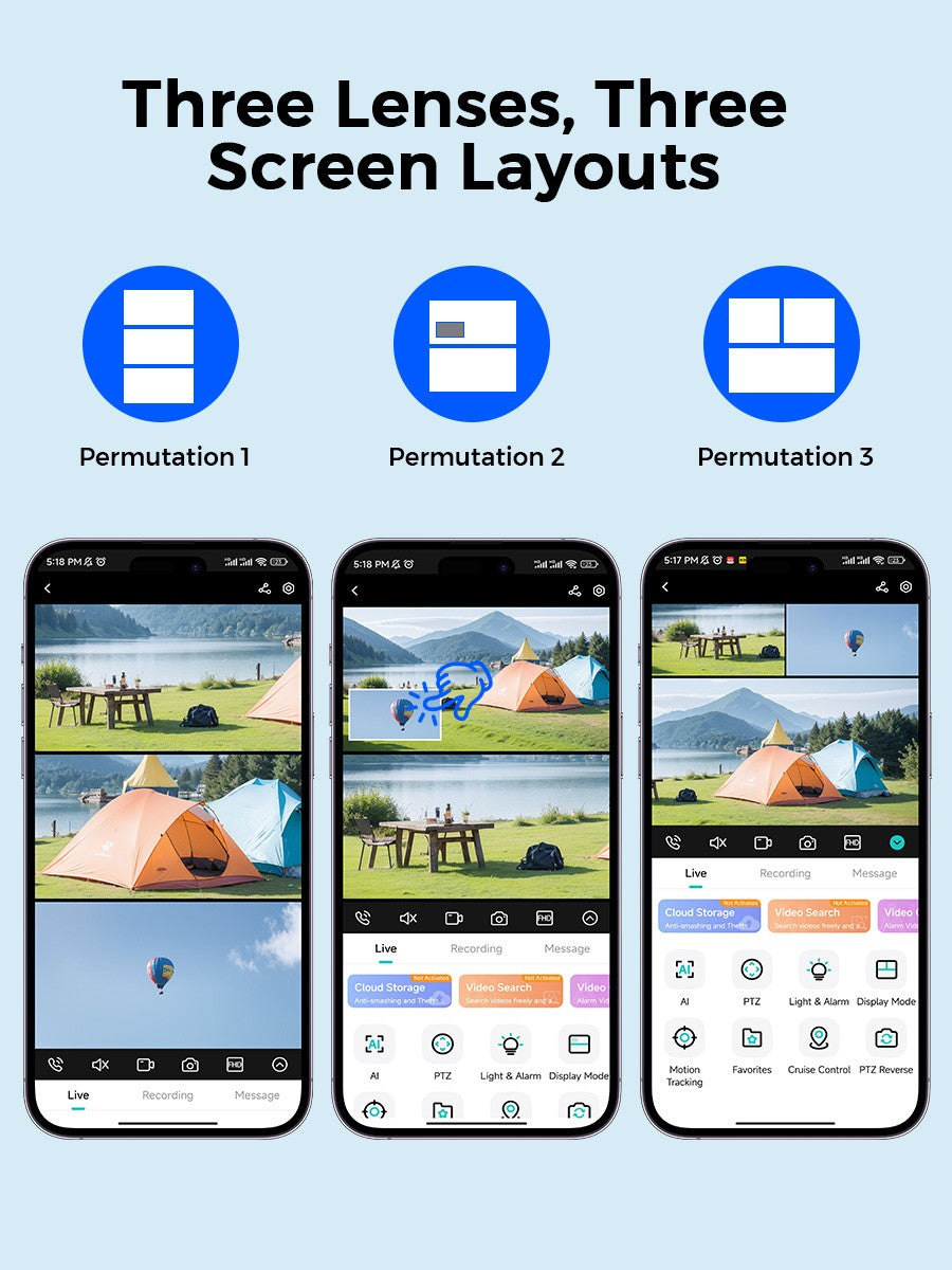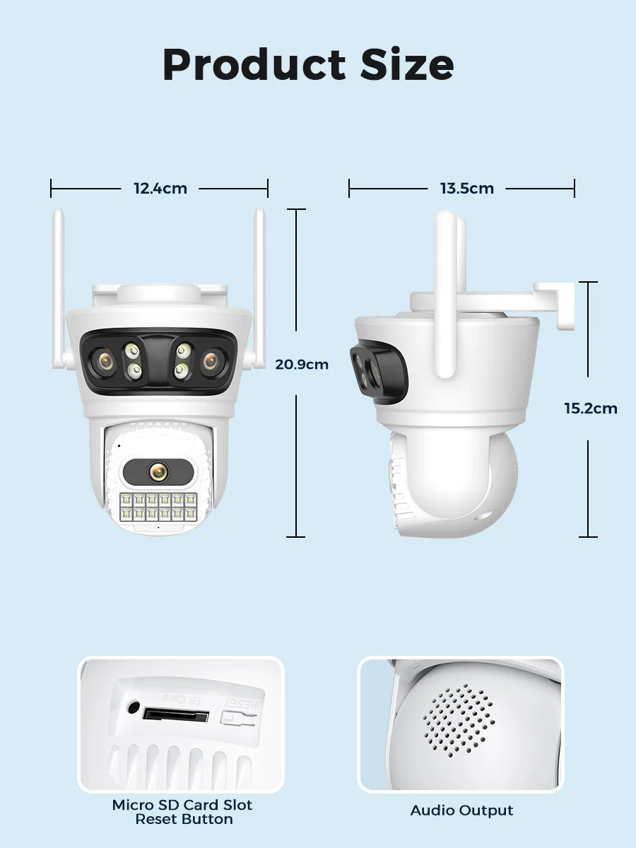 ? 12MP / 6MP Wifi Camera has three Lens with Three Screen, the lower camera supports PTZ, while the left and right cameras in the upper part do not support PTZ and only support manual rotation