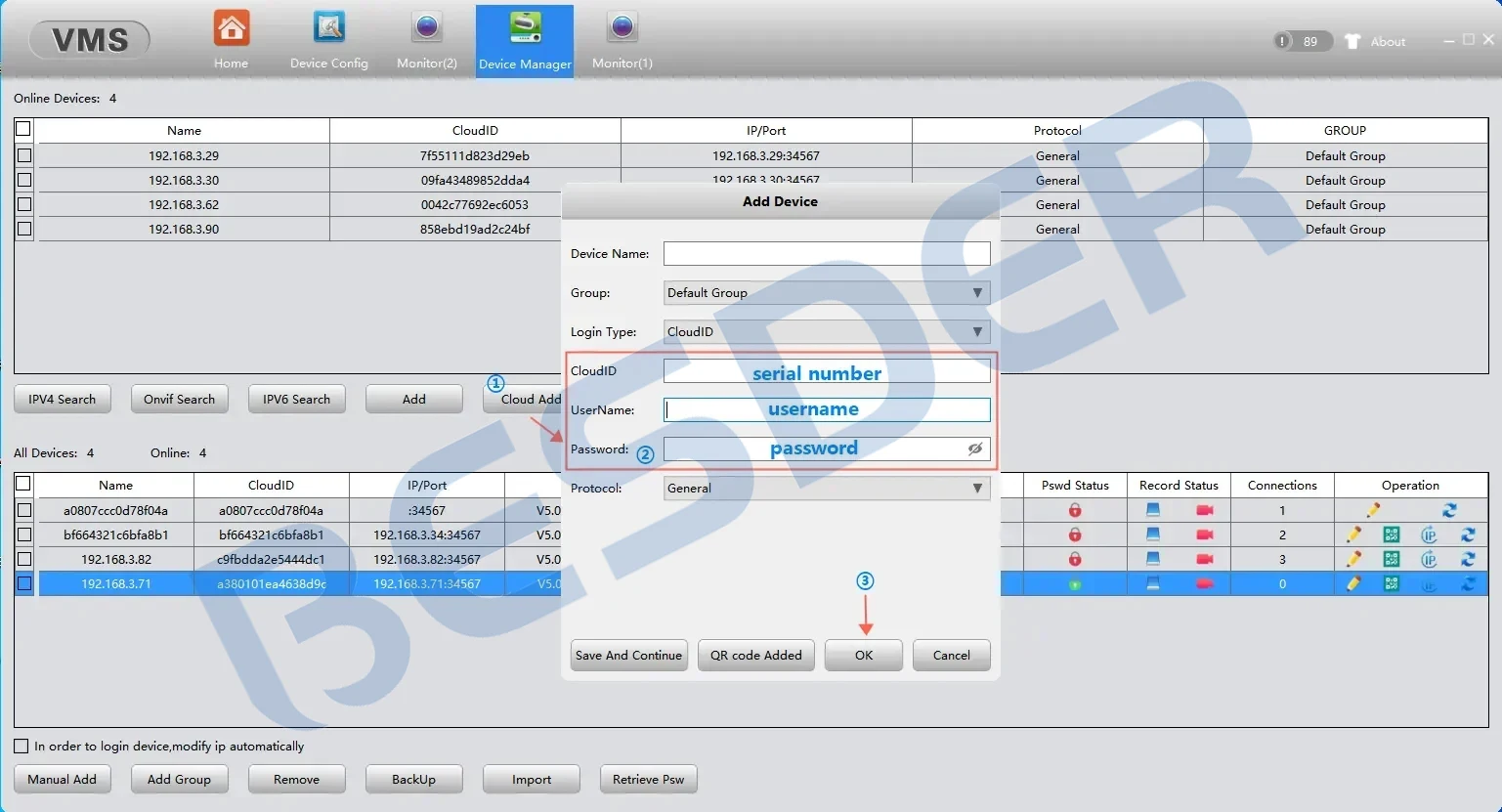? Find the complete serial number, password and user name in the icsee app and enter it into the VMS software and add it successfully