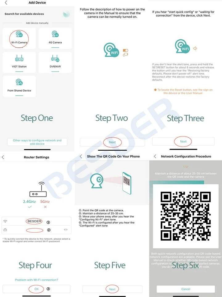 ? Connect the camera through the 2.4G HZ Wifi network band, follow the 6 steps in the picture to connect, and you can configure it successfully.