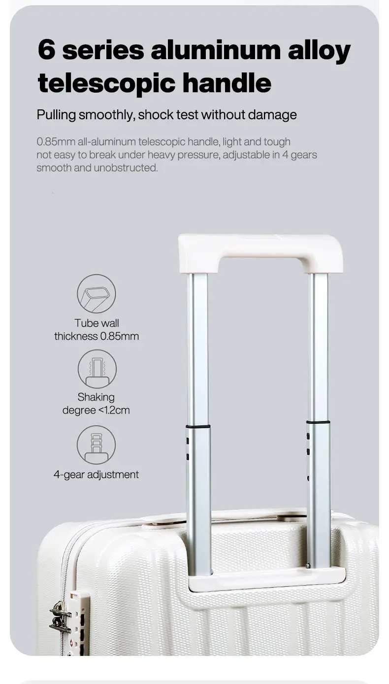 The telescopic handle is close to the inside of the box, which greatly enhances the space used of the case. Made of double thick aluminum alloy(0.8mm) to enhance the strength of the handle while enhancing the appearance.