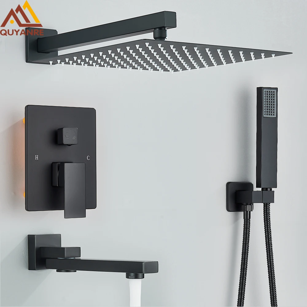 Quyanre Matte Black Shower Faucets Set Rain Waterfall Concealed Shower System Wall Mount Bathtub Shower Mixer Shower Combo Set
