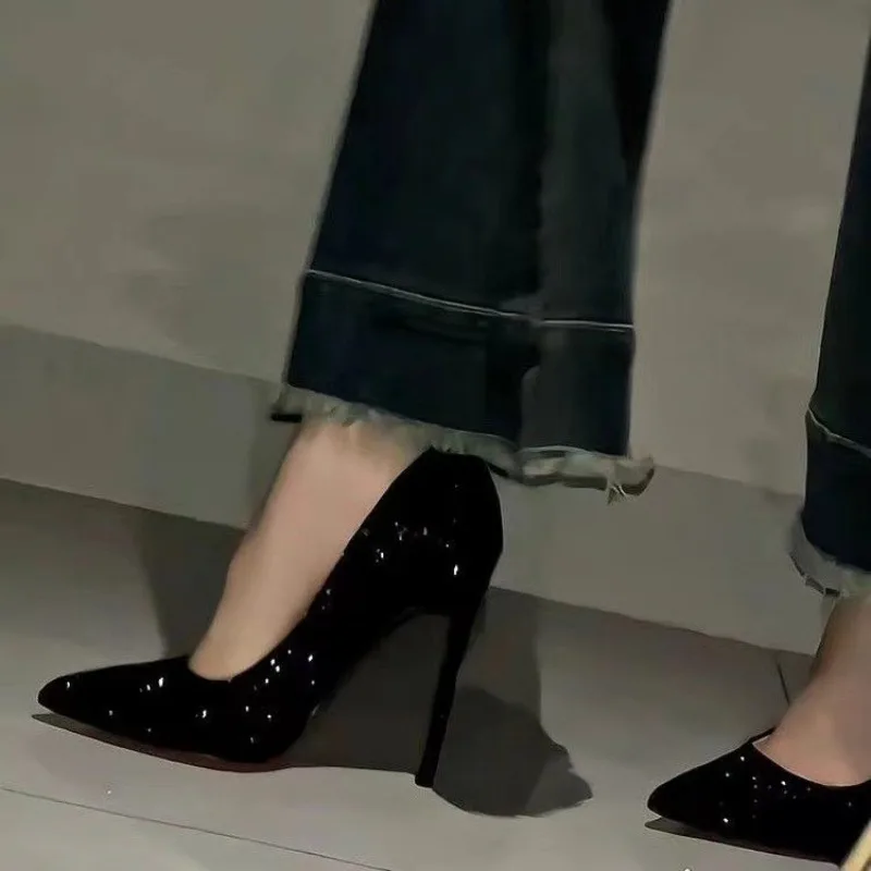 Black Crystal Fashion Pointed Toe Women's High Heels Mature Banquet Red Bottom Women's Shoes Hot Sale