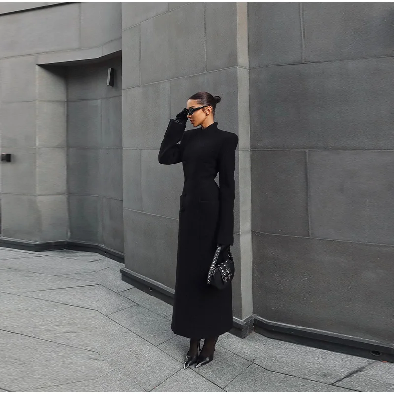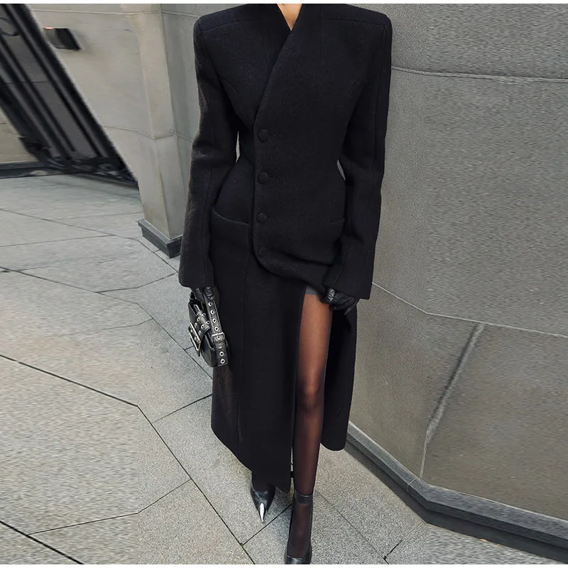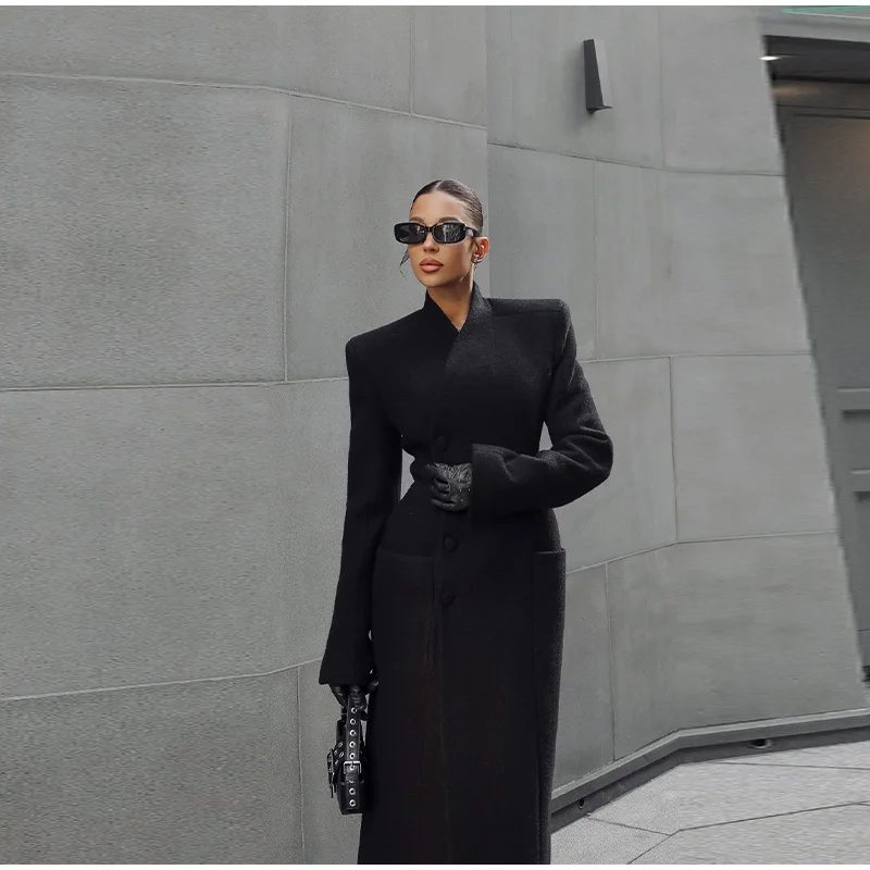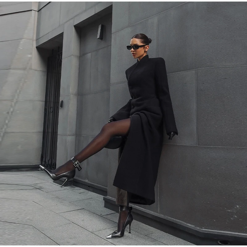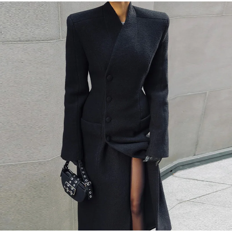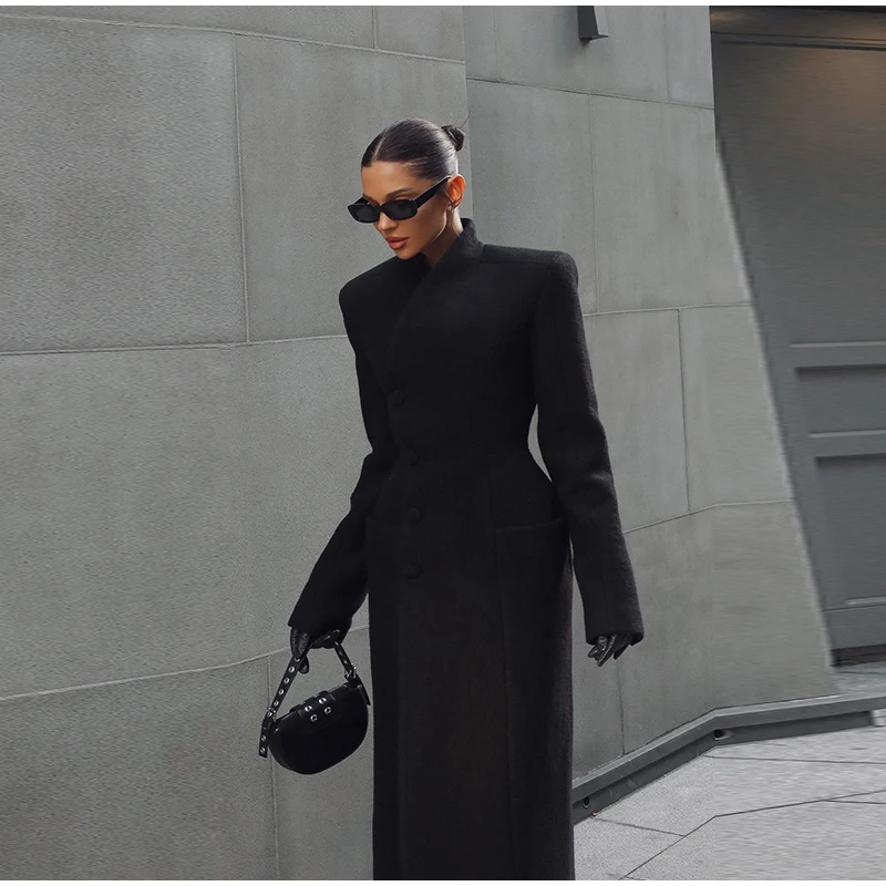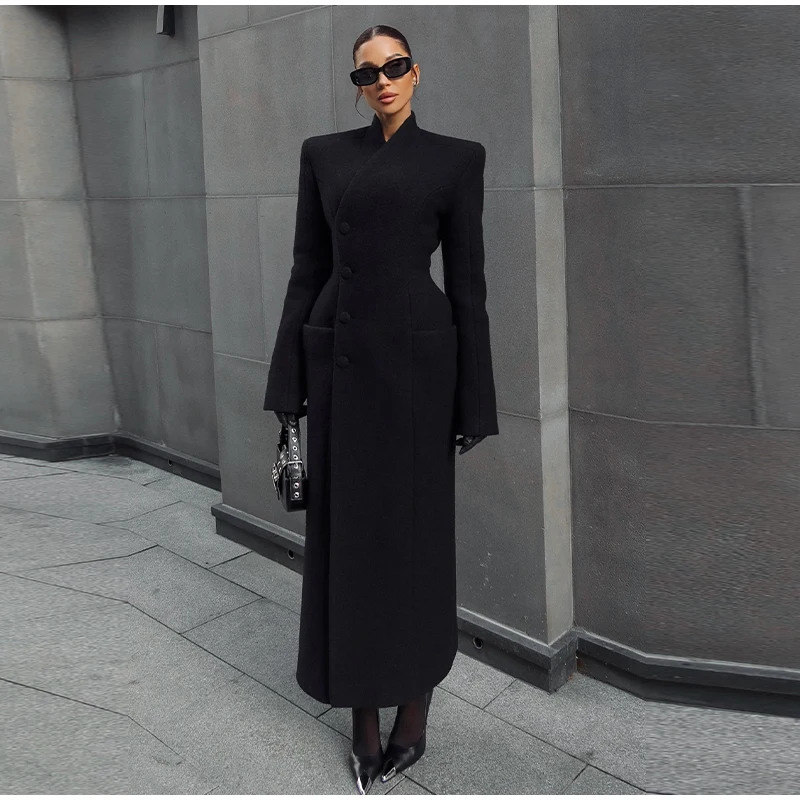 Black Tailored Long Coat Women Elegant Asymmetric Button Front Pockets Full Sleeve Criss-cross Neck Jacket 2025 Casual Outerwear