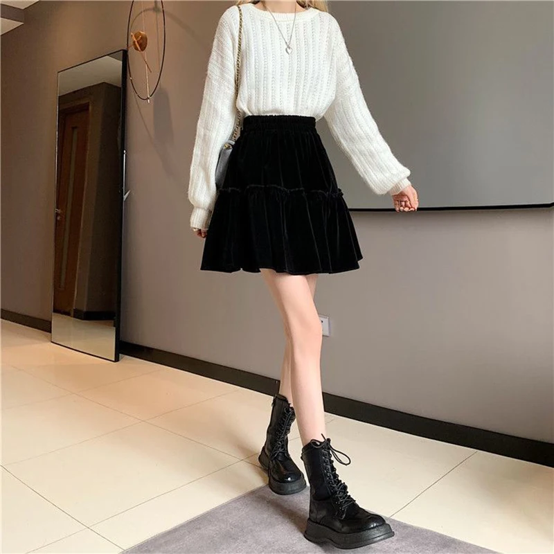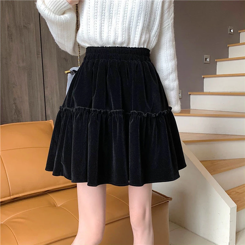 Black Velvet Patchwork Mini Skirt Women Sweet Solid A Line High Waist Skirt Fashion Pretty Style Pleated Summer Student Skirt