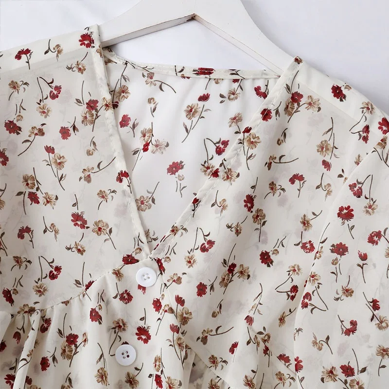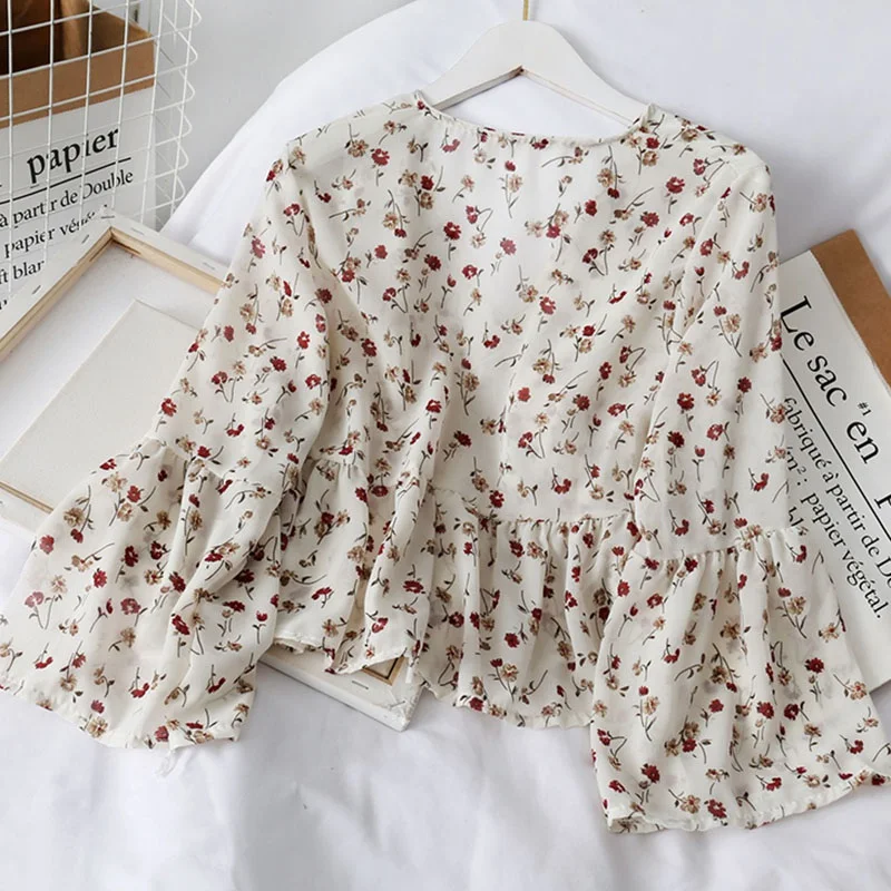 Blouses Women Temperament V Neck Floral Print Sweet Small Fresh Long Sleeves Chiffon Shirt Autumn All-match Short Crop Top