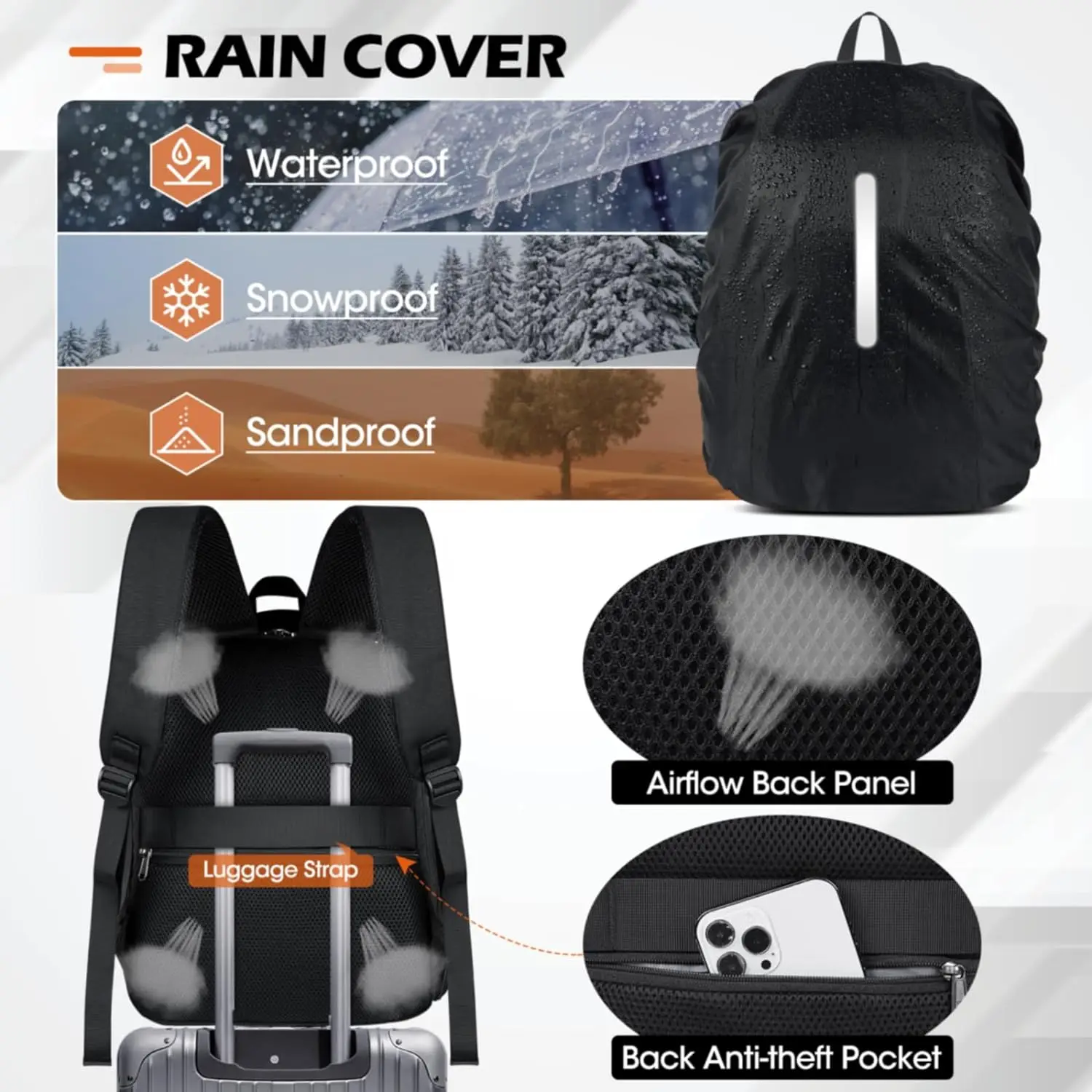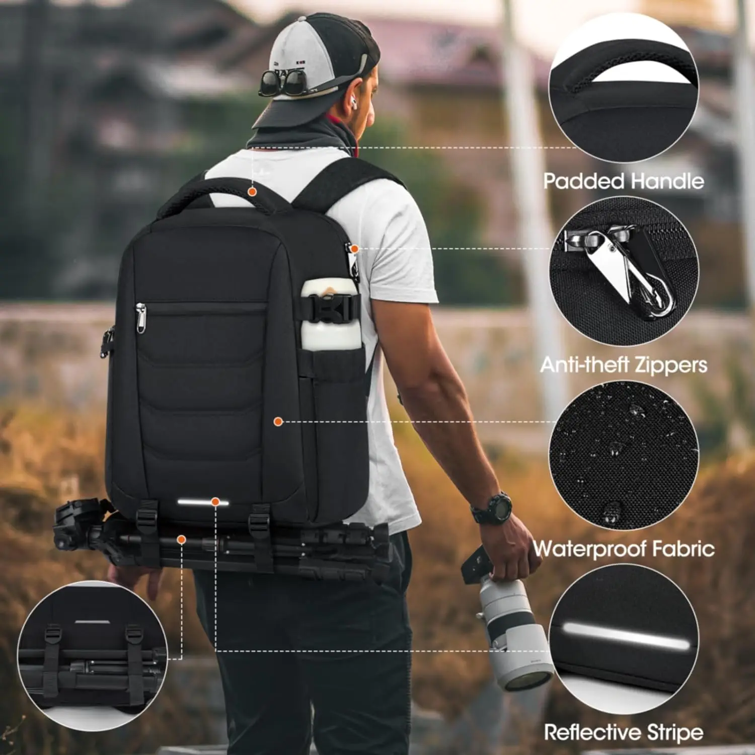 3. Crafted from premium,waterproof,and durable Oxford fabric,photography backpack includes an extra rain cover for double waterproof protection on rainy days. To enhance waterproof performance,the front pocket features a waterproof zipper.