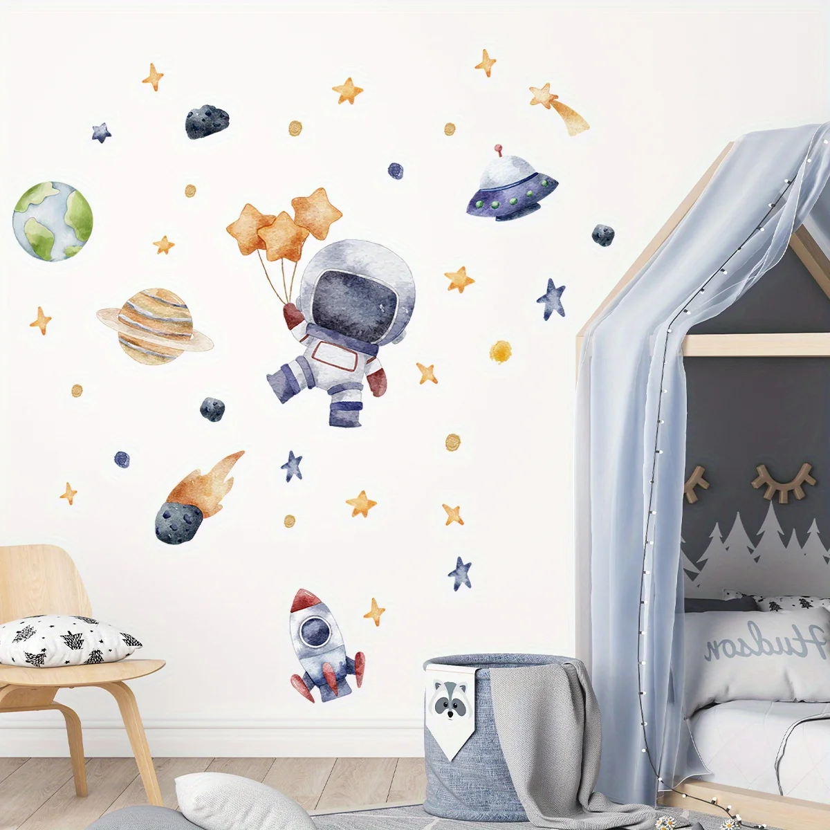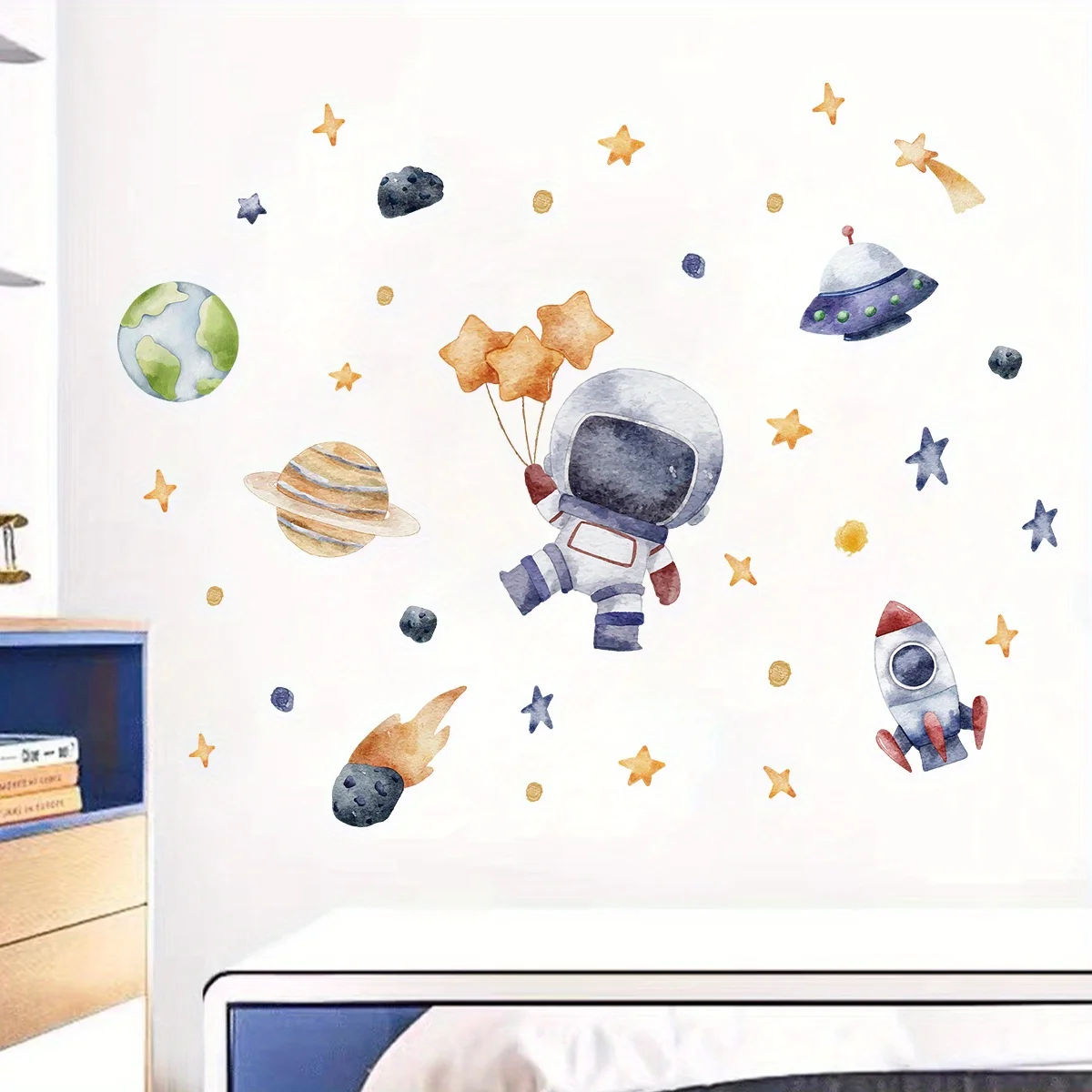 Cartoon Cute Astronaut Spaceship Rocket Planet Star Space Wall Stickers for Bedroom Living Room Nursery Decoration Wall Decal