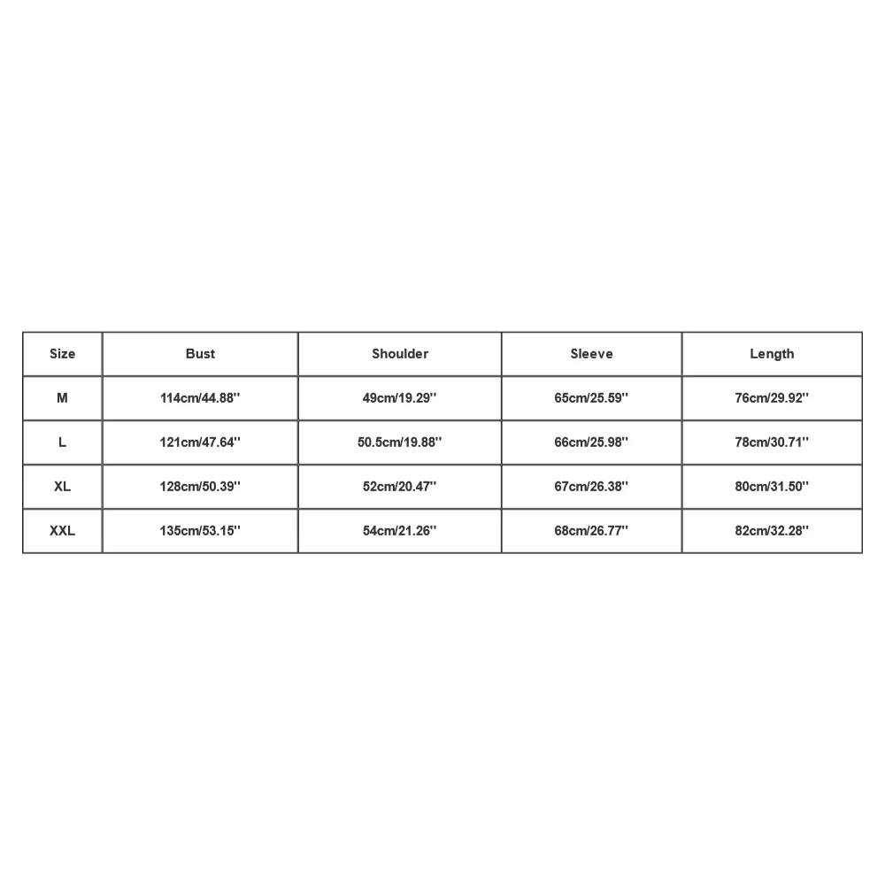 | Size:XL | Bust:128cm/50.39'' | Shoulder:52cm/20.47'' | Sleeve:67cm/26.38'' | Length:80cm/31.50'' |