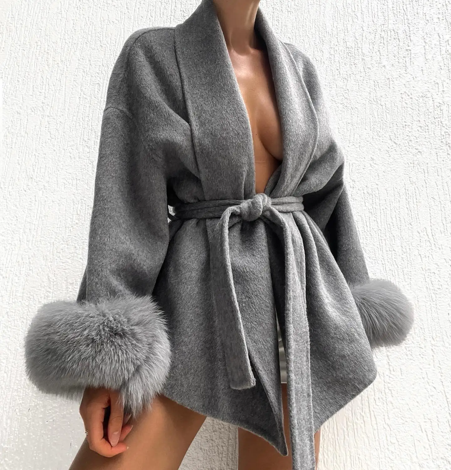 Casual Fur Patchwork Lace Up Woolen Coat Women Elegant V-neck Full Sleeve Loose Outerwear Lady Autumn Daily Commute Street Coats