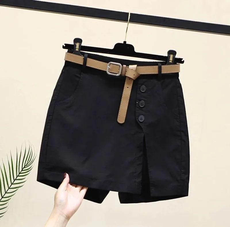 Chic Shorts Women Belt Korean Solid Buttons Side Slit A-line Streetwear Fashion Skirts Chic Harajuku Summer Loose Pants