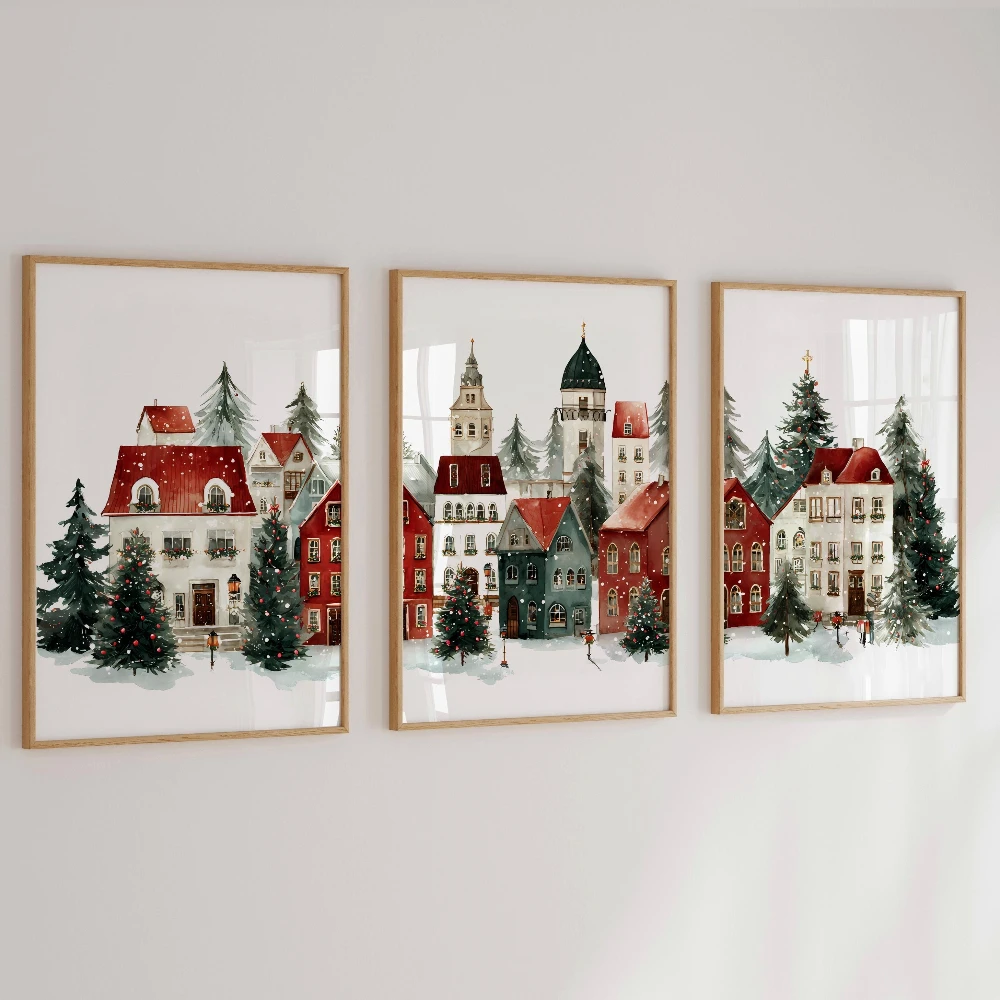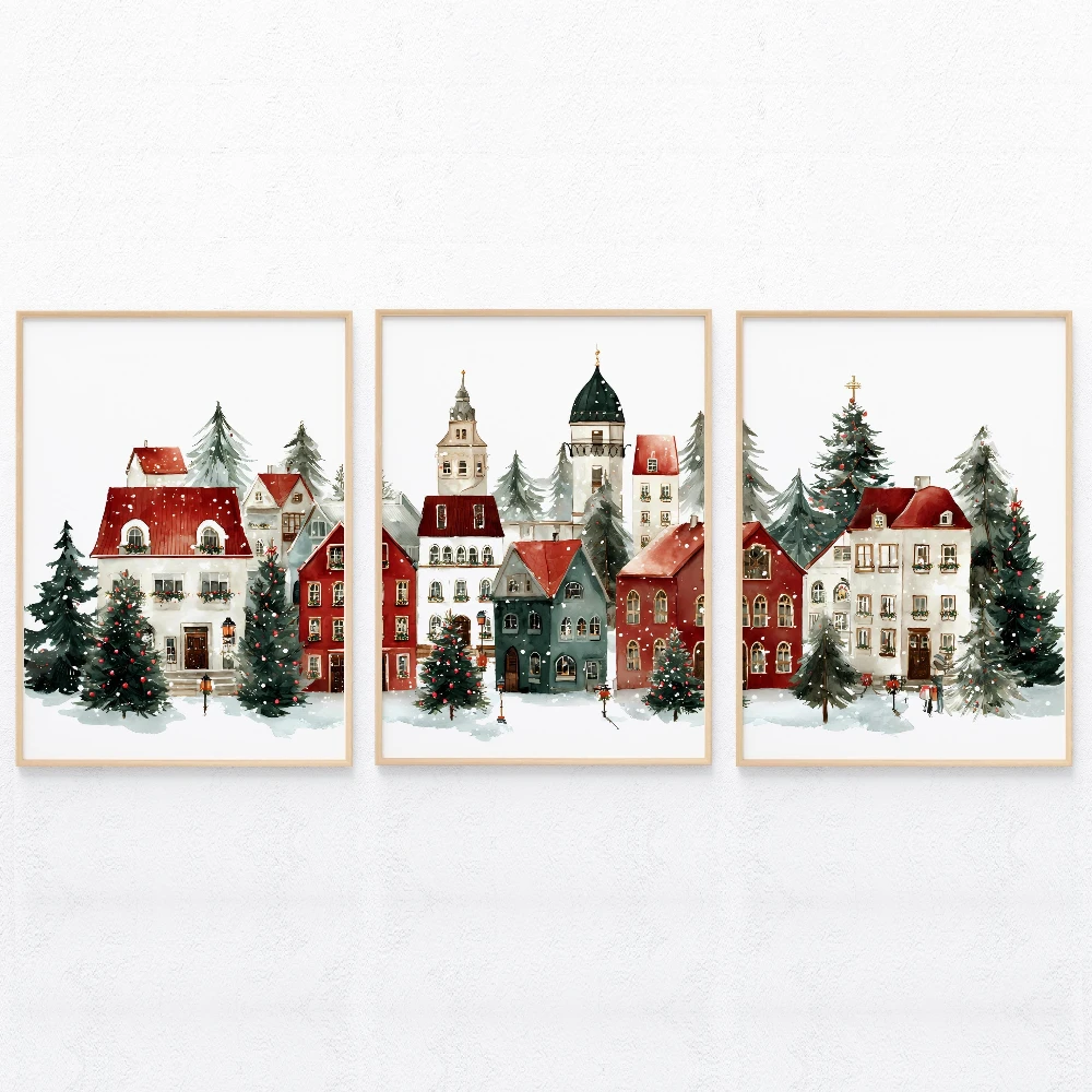 Christmas Village Prints Set of 3 Snowy Winter Town Paintings Christmas Poster Print for Living Room Xmas Santa Decoration