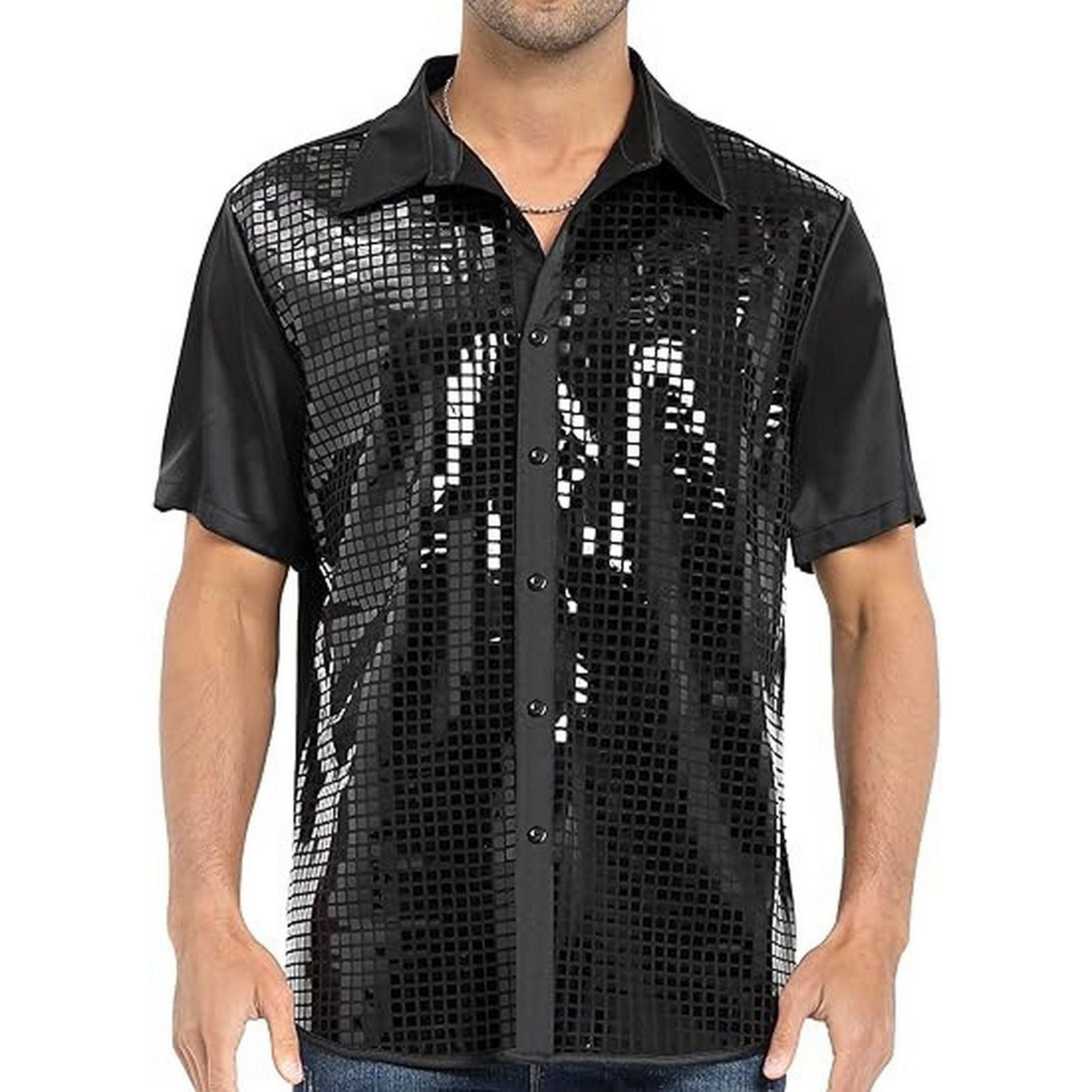 Introducing our Men's Shiny Shirt, a classic design with a modern twist. This shirt features a turn-down collar and collar buttons for a sophisticated look. The unique retro button design adds a touch of elegance, while the short sleeves with square sequins bring a subtle sparkling to your outfit. Made from premium linen fabric, this shirt offers a light, breathable, and natural feel, keeping you cool and comfortable all day long. With its loose fit, it provides a casual and stylish look that can be easily paired with casual shorts, pants, or jeans. You can also elevate your style by accessorizing with sunglasses and cowboy hats for a prom dress look. Available in 4 colors, this shirt allows you to express your personal style effortlessly. Perfect for 70s disco party cosplay or Halloween costumes, this men's dress shirt is versatile and fashionable. Don't miss out on this must-have addition to your wardrobe!