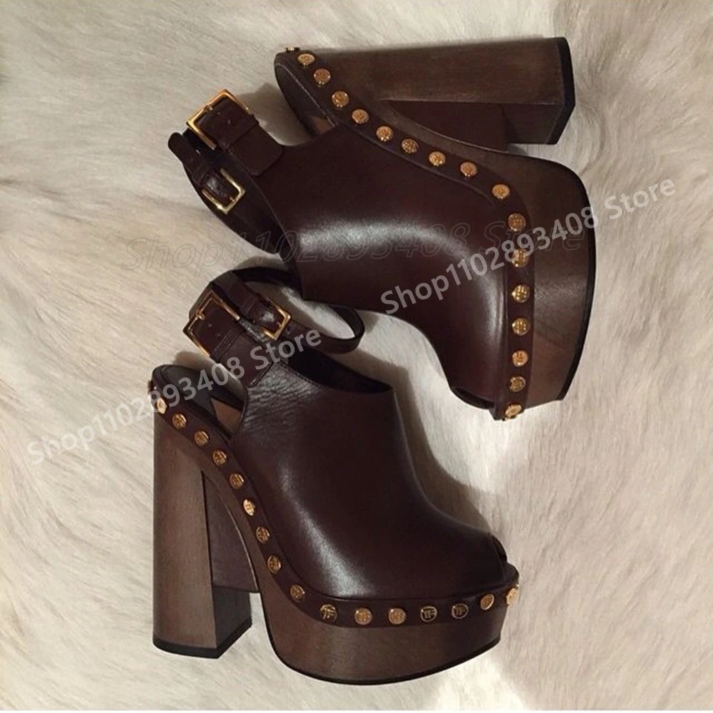Coffe Matte Leather Round Rivets Pumps Peep Toe Chunky High Heel Elegant Fashion Women Shoes 2025 Summer Zapatos Para Mujere