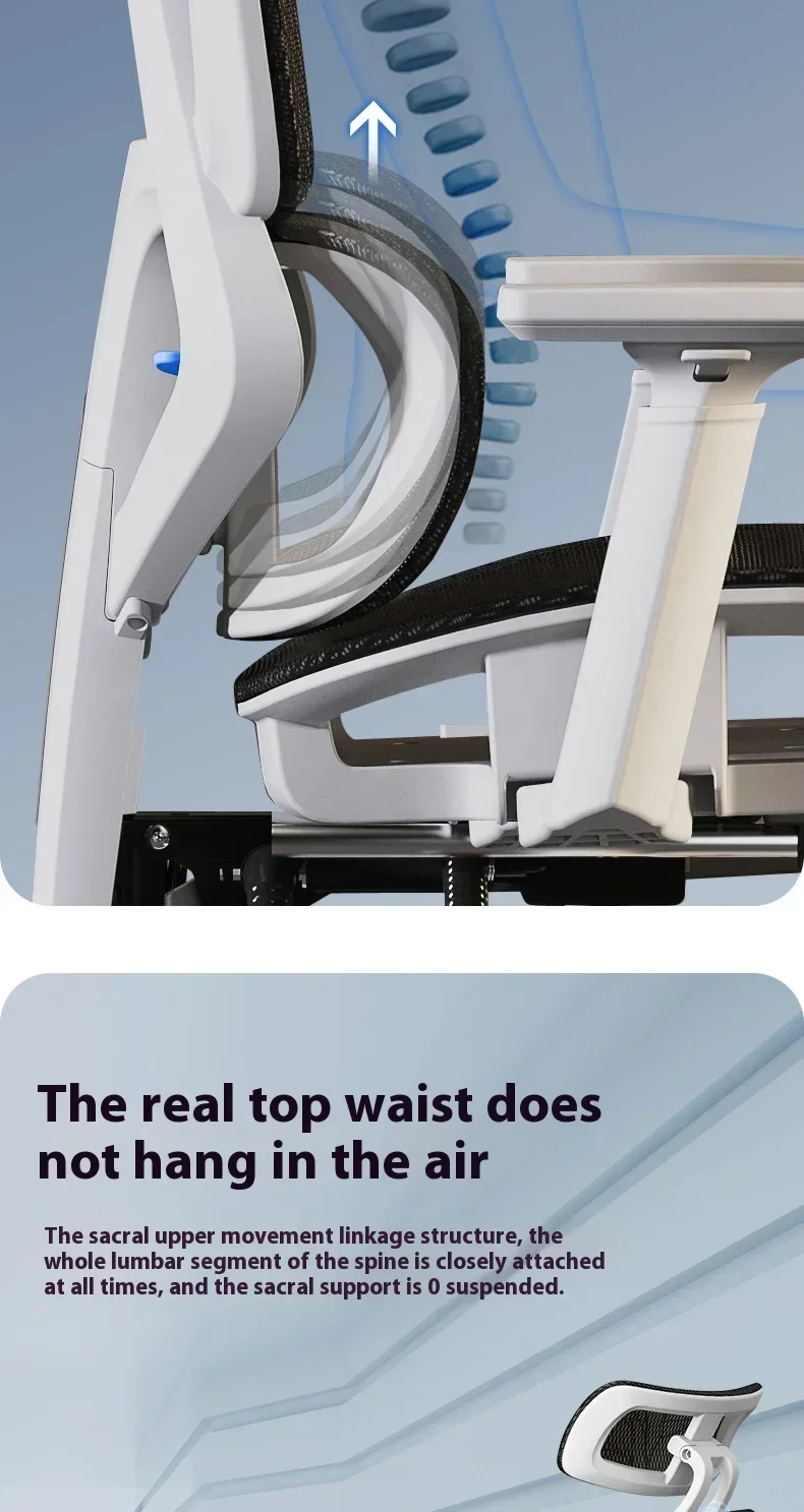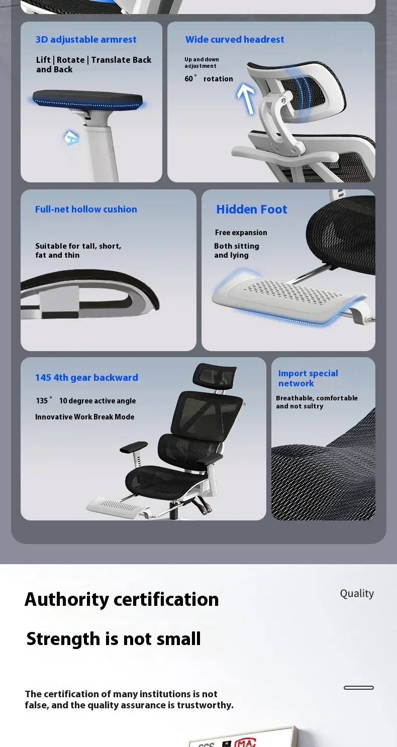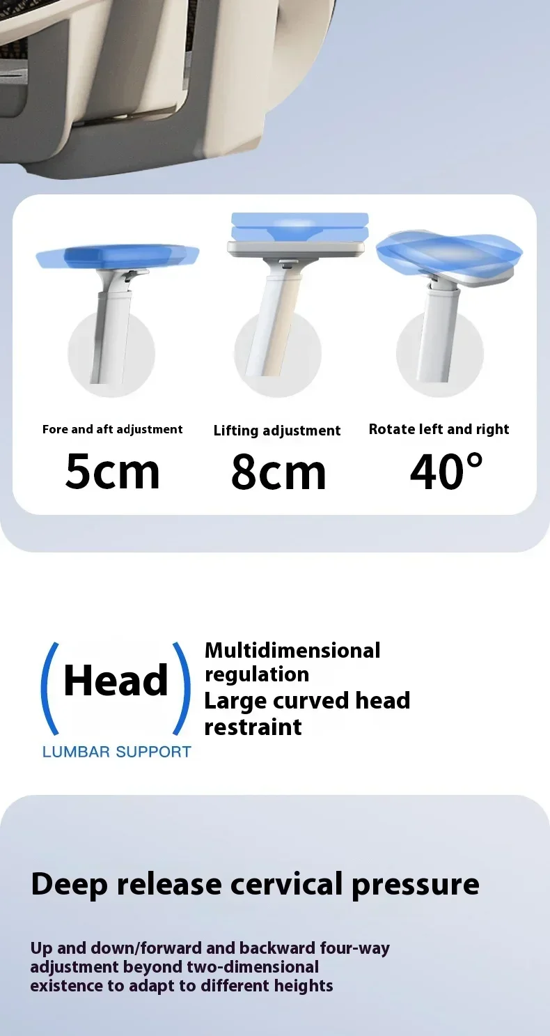 2. Elastic adaptive lumbar support, 3D adjustable neck pillow, 3D armrests, 2 zones of separation of the lumbar back, 5cm sitting depth adjustable, 145 ° comfortable back lying