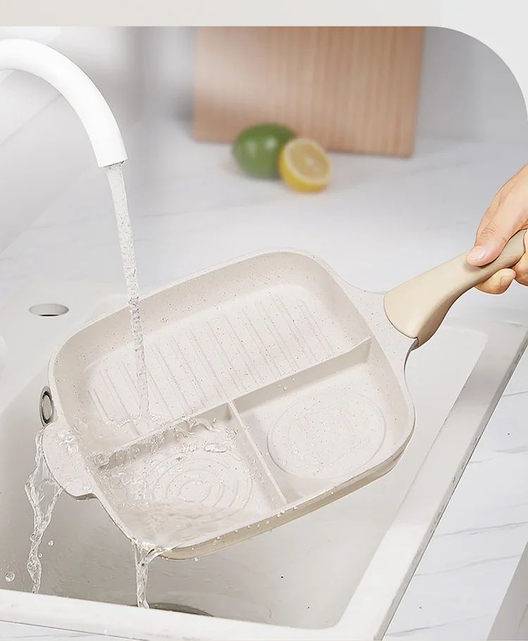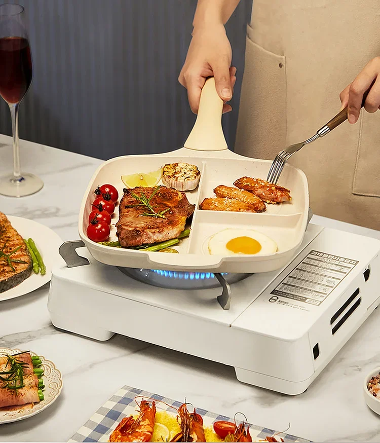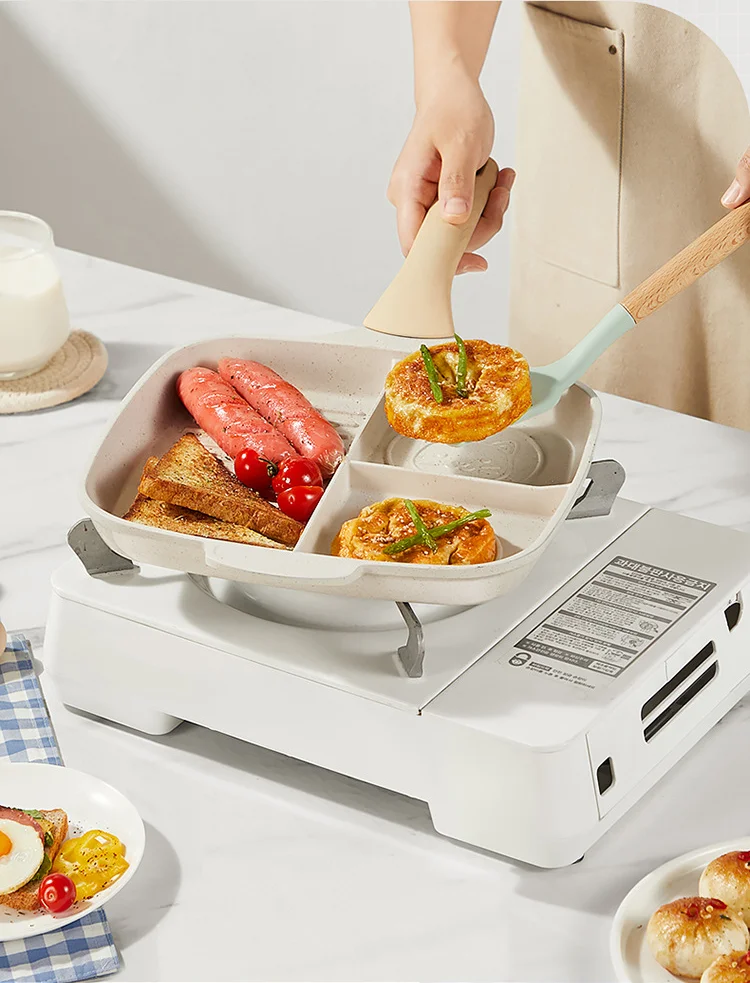 - Versatile Compartments: Comes with divided sections, allowing you to cook multiple foods like eggs, sausages, and toast at the same time without mixing flavors.