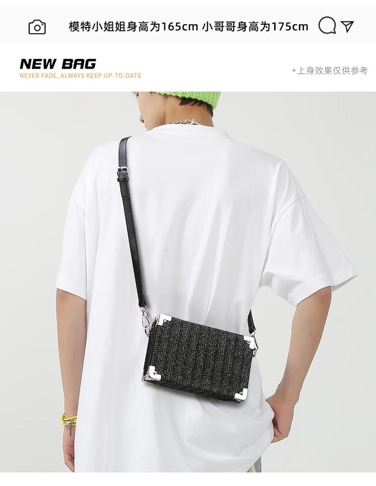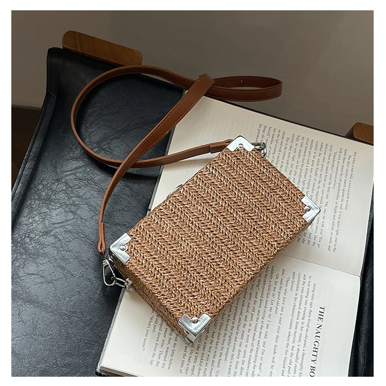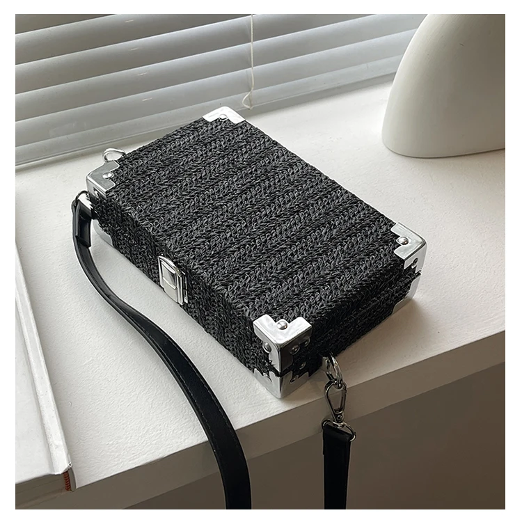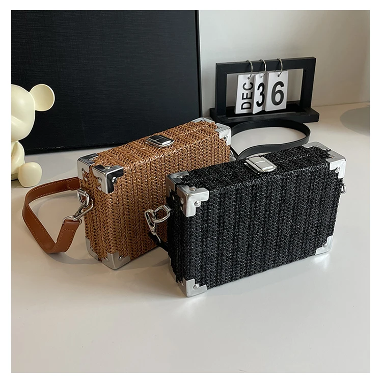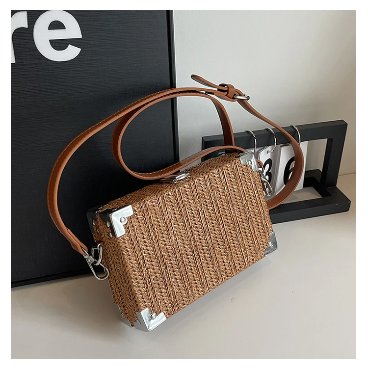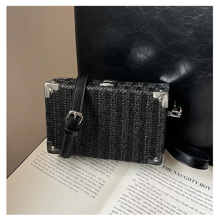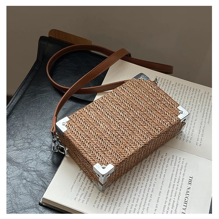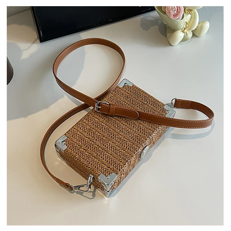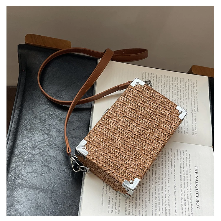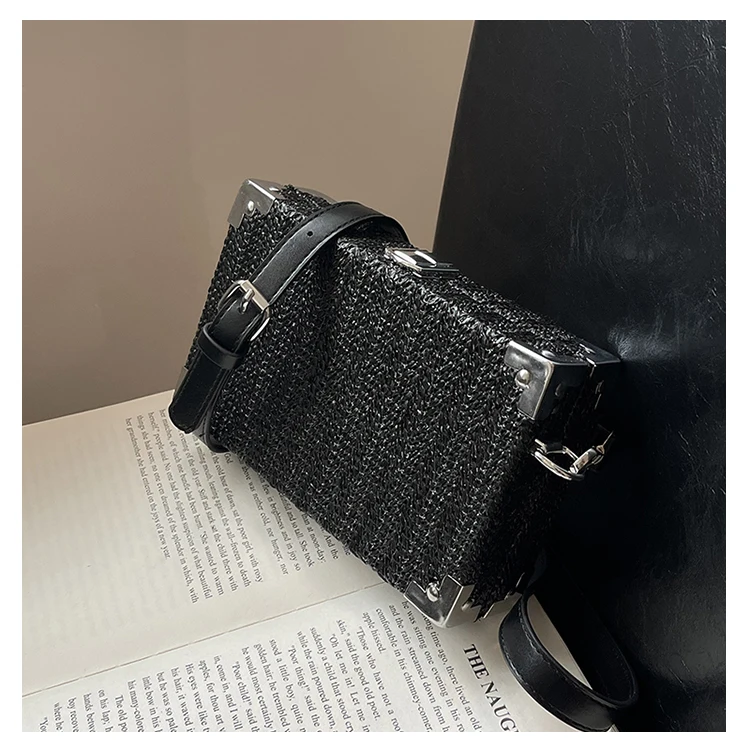 Couple's Sling Bag Straw Weaving with Corner Metal Decoration Boxy Shape Doctor Bag for Date Back to School Party Shoulder Bag
