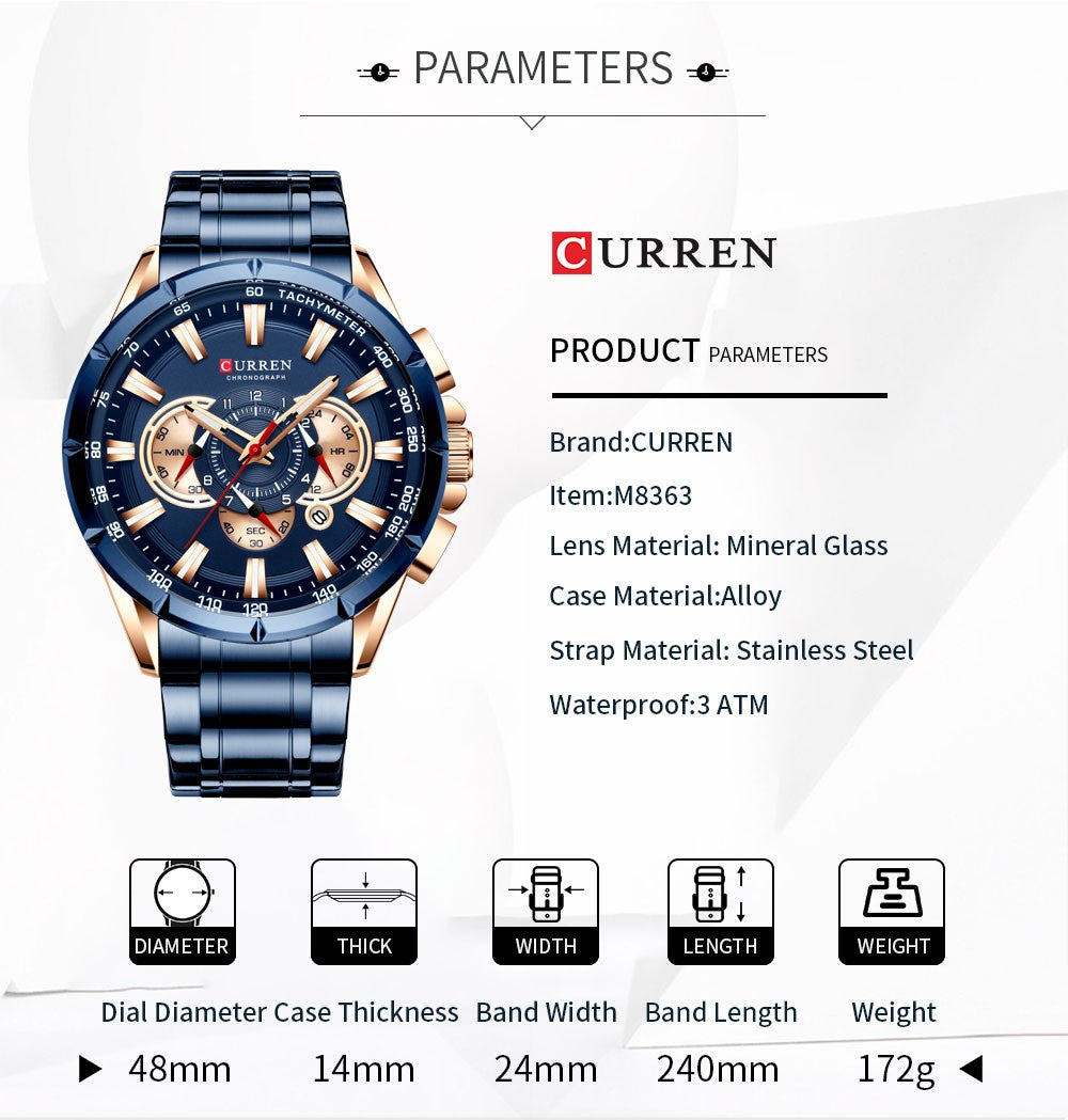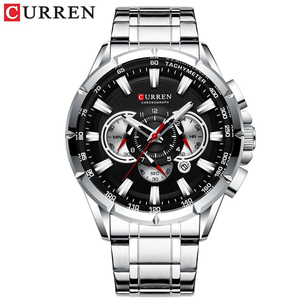 CURREN New Casual Sport Chronograph Men's Watches Stainless Steel Band Wristwatch Big Dial Quartz Clock with Luminous Pointers