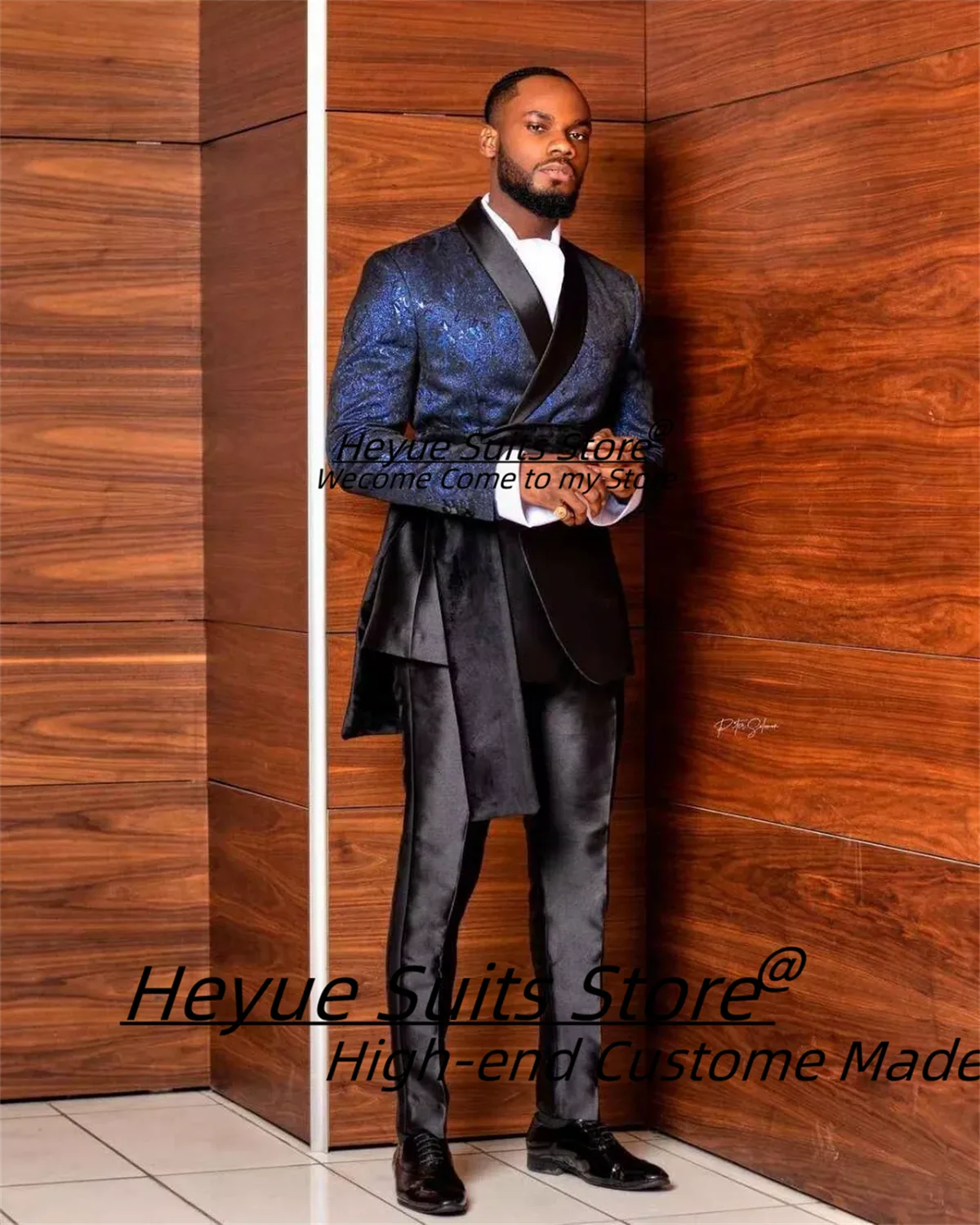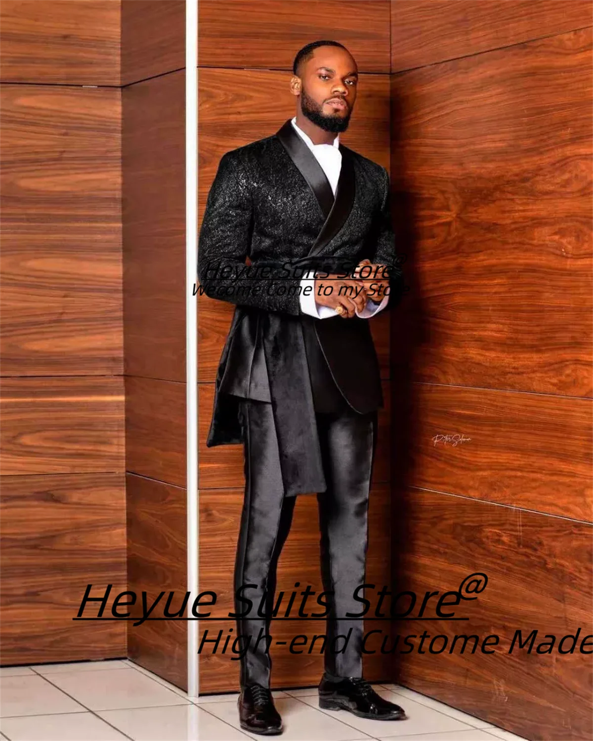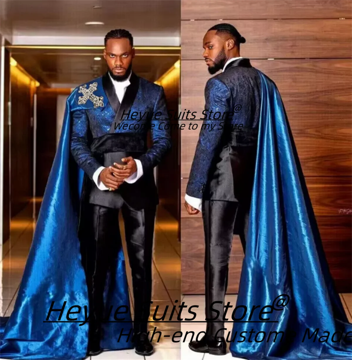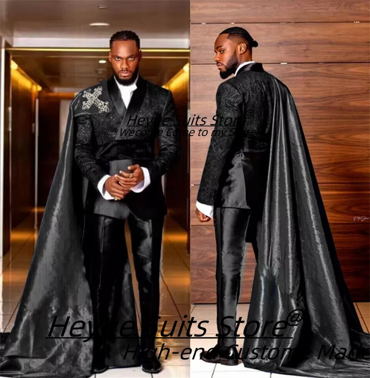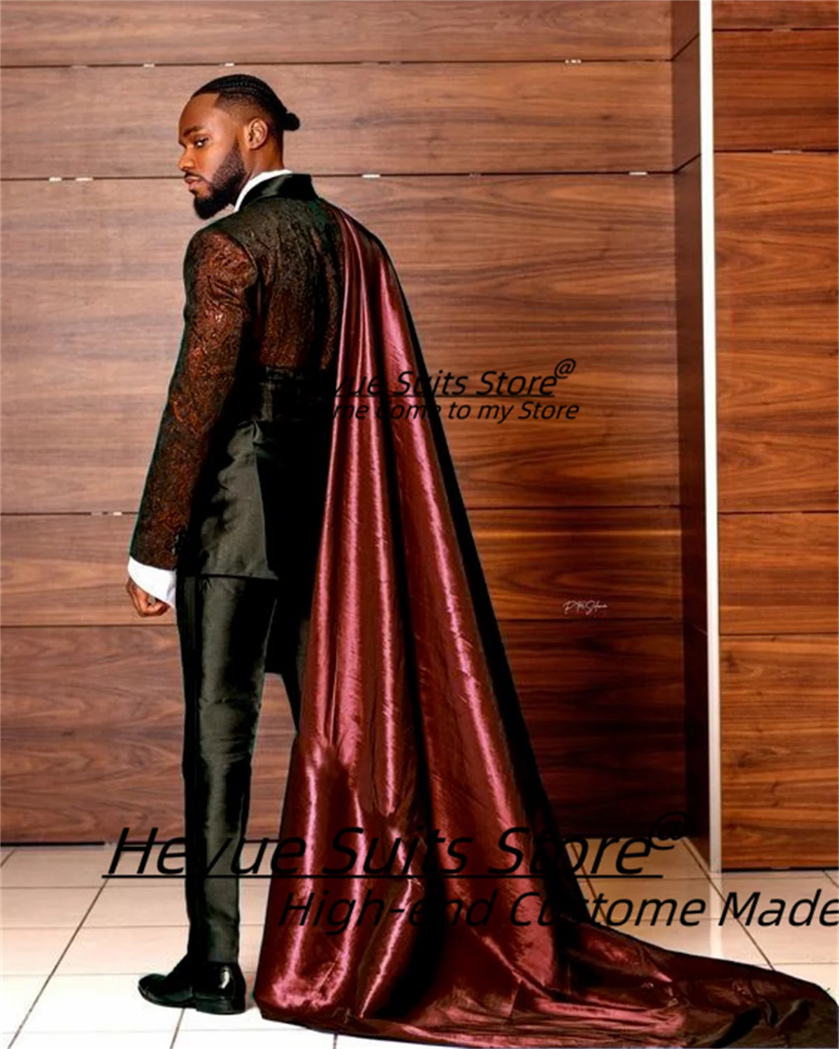 Customized Black Jacquard Shawl Lapel Jacket Pant Cape Groom Wedding Tuxedos Luxuly Male Prom Party Blazers Handsome Ropa Hombre