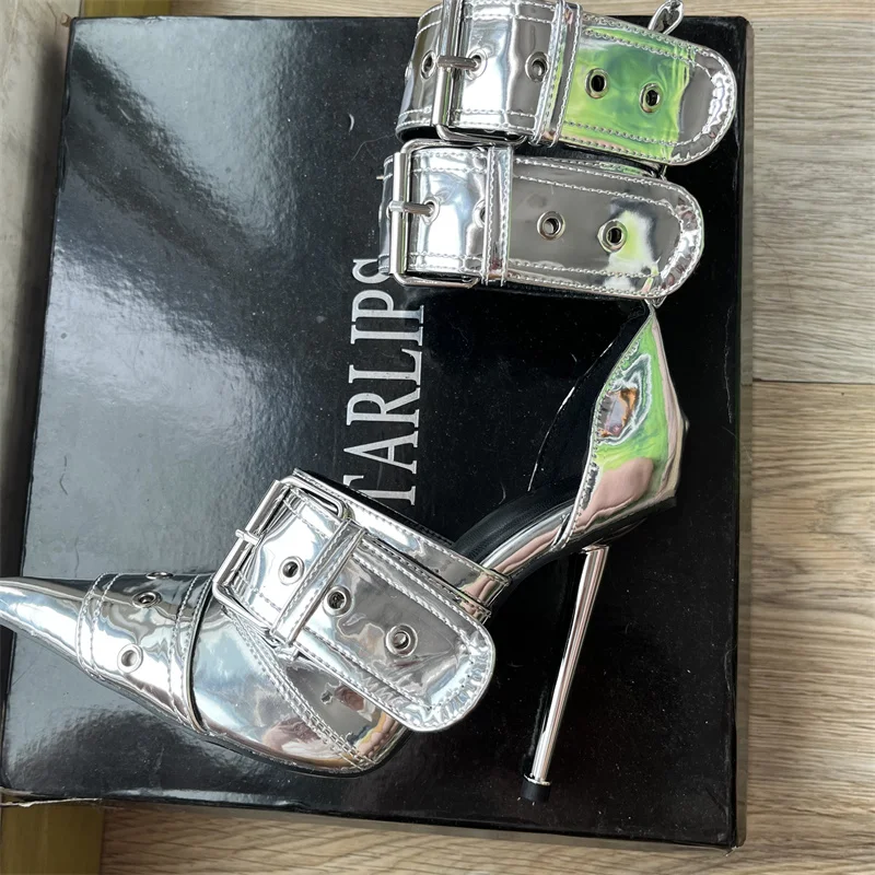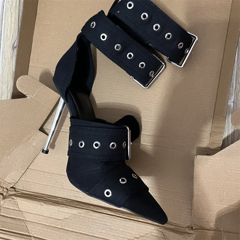 Denim Metal Rivet Buckle Silver Sandals Women's Sexy Punk Style Pointed Metal Hollow 12cm High Heels Size 34-43 Womens Shoes