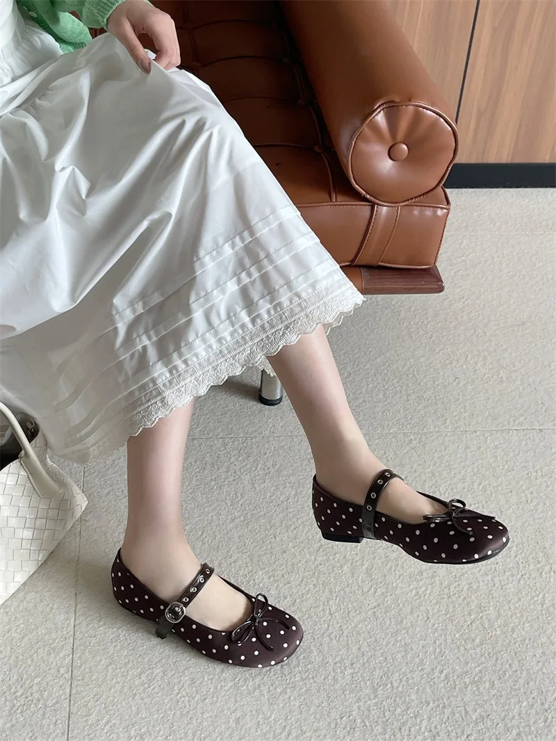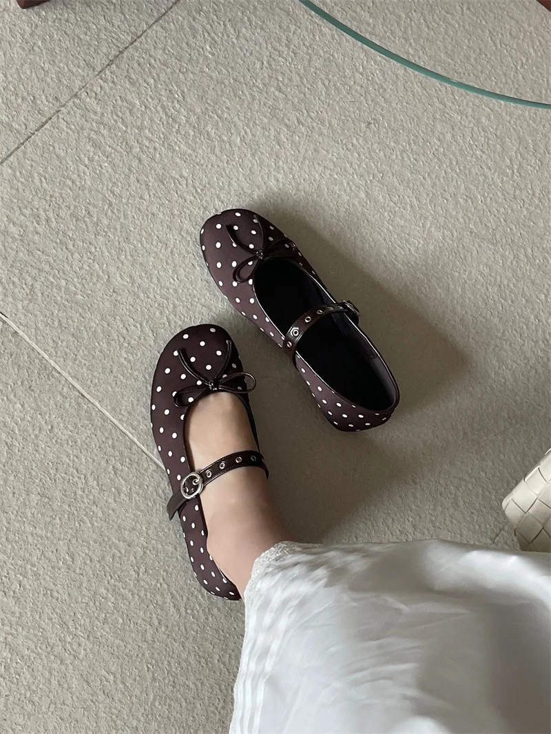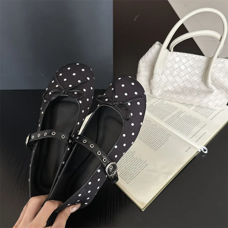 Designer Polka Dot Ballet Flats for Women Sweet Bow Decoration Elegant Mary Jane Shoes Fashion Buckle Shallow Comfort Dress Shoe