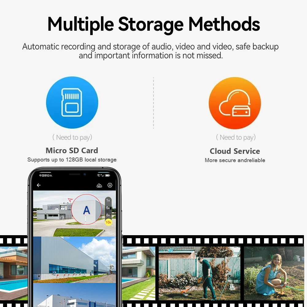 --Difang security cameras wireless outdoor support two storage options – SD card local storage (not included), up to 128GB without monthly fees; or cloud storage with a free 30-day trial,
