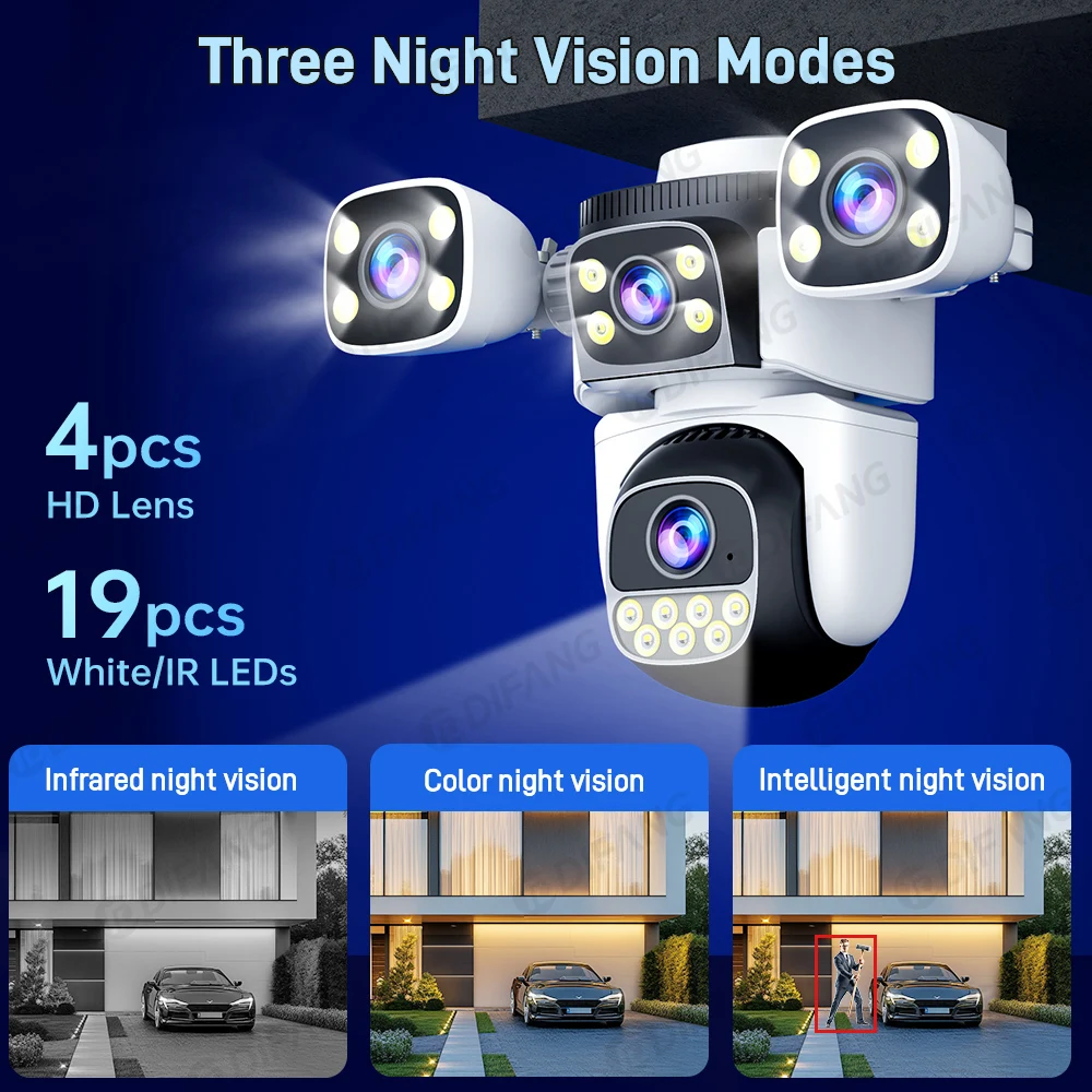 DIFANG 20MP 4 Screens WiFi Security Camera Outdoor 5X Zoom Quad Lens Auto Tracking Waterproof Night Vision CCTV Cameras