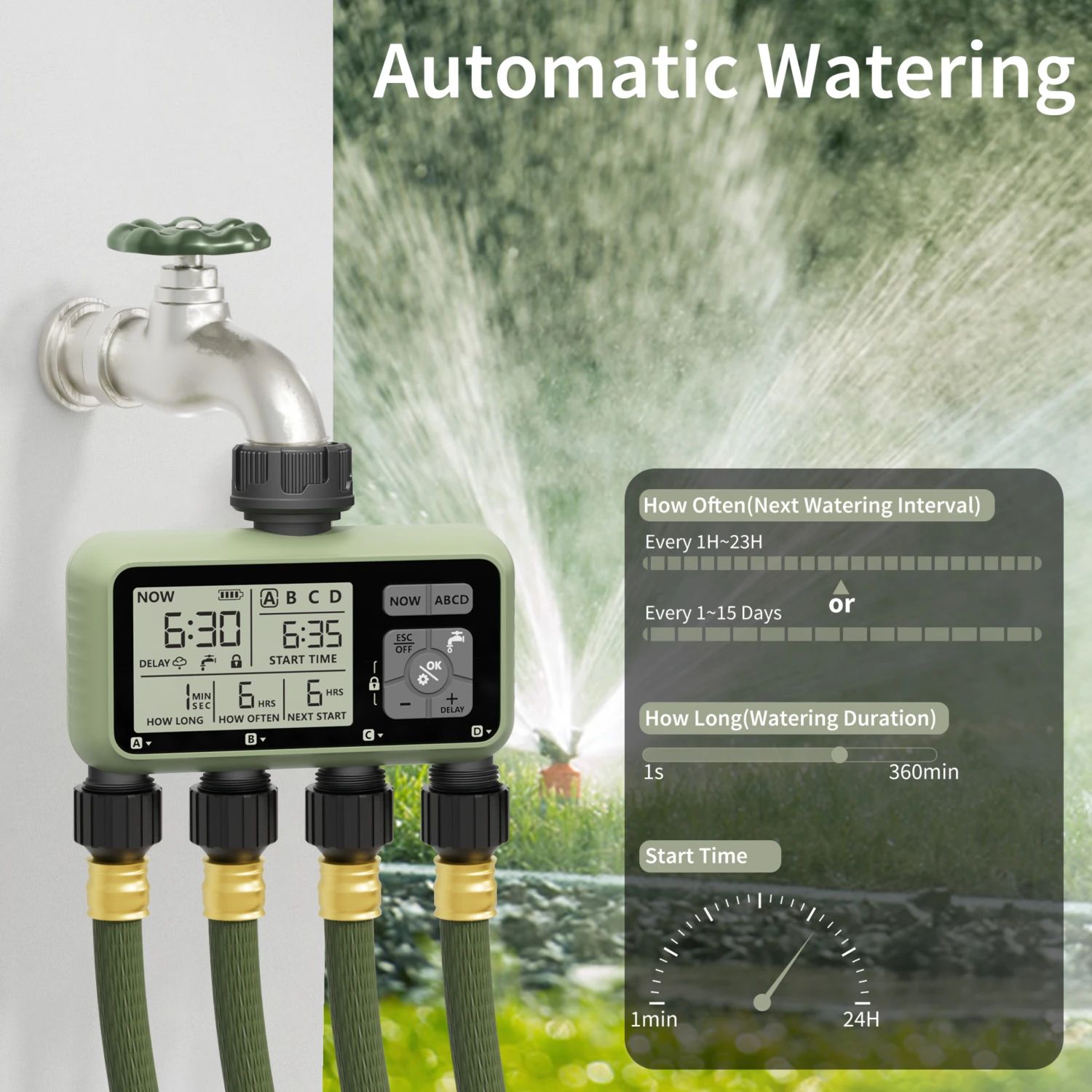 Diivoo Water Timer 4 Zone Garden Programmable Automatic Irrigation Timer with Rain Delay Manual/Auto Mode Watering for Lawn Yard