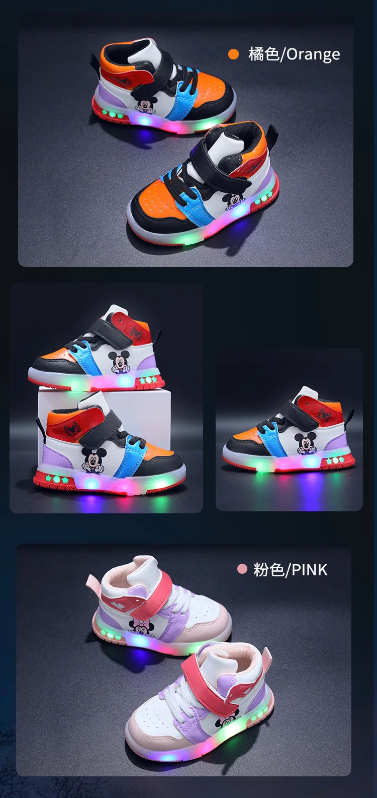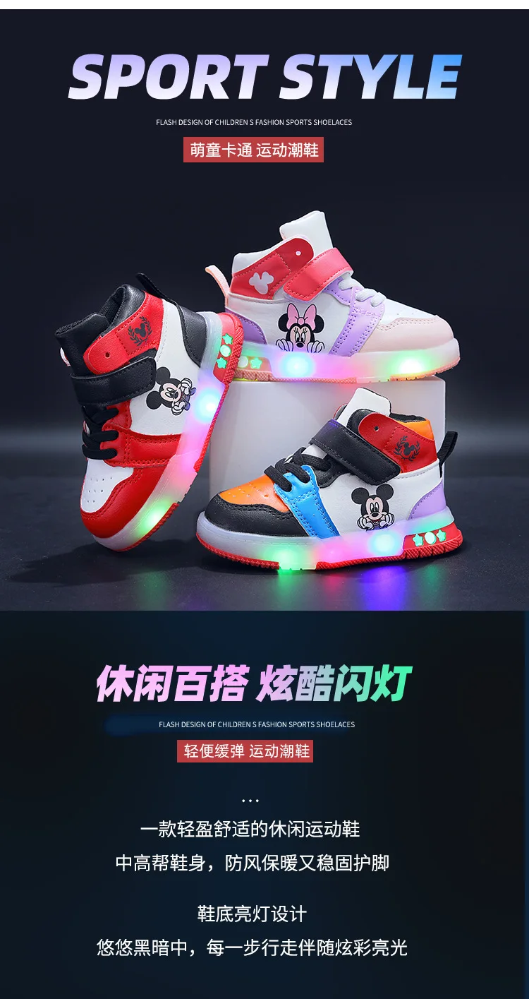 Disney Children's Sneakers Boys Girls Mickey Led Light Sport Shoes Student Shoes Hook Anti-slip Kids Outdoor Shoes Basket Shoes