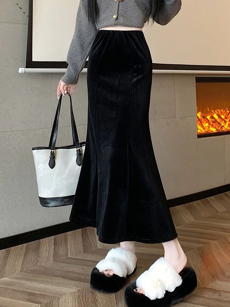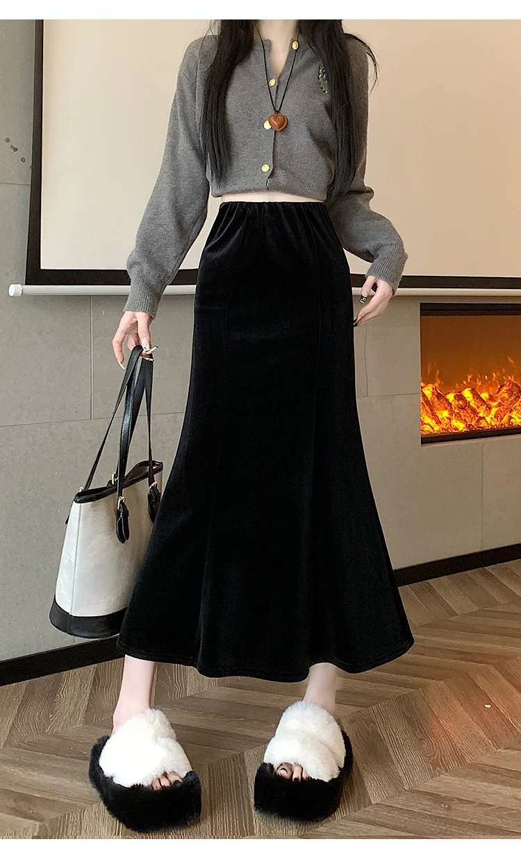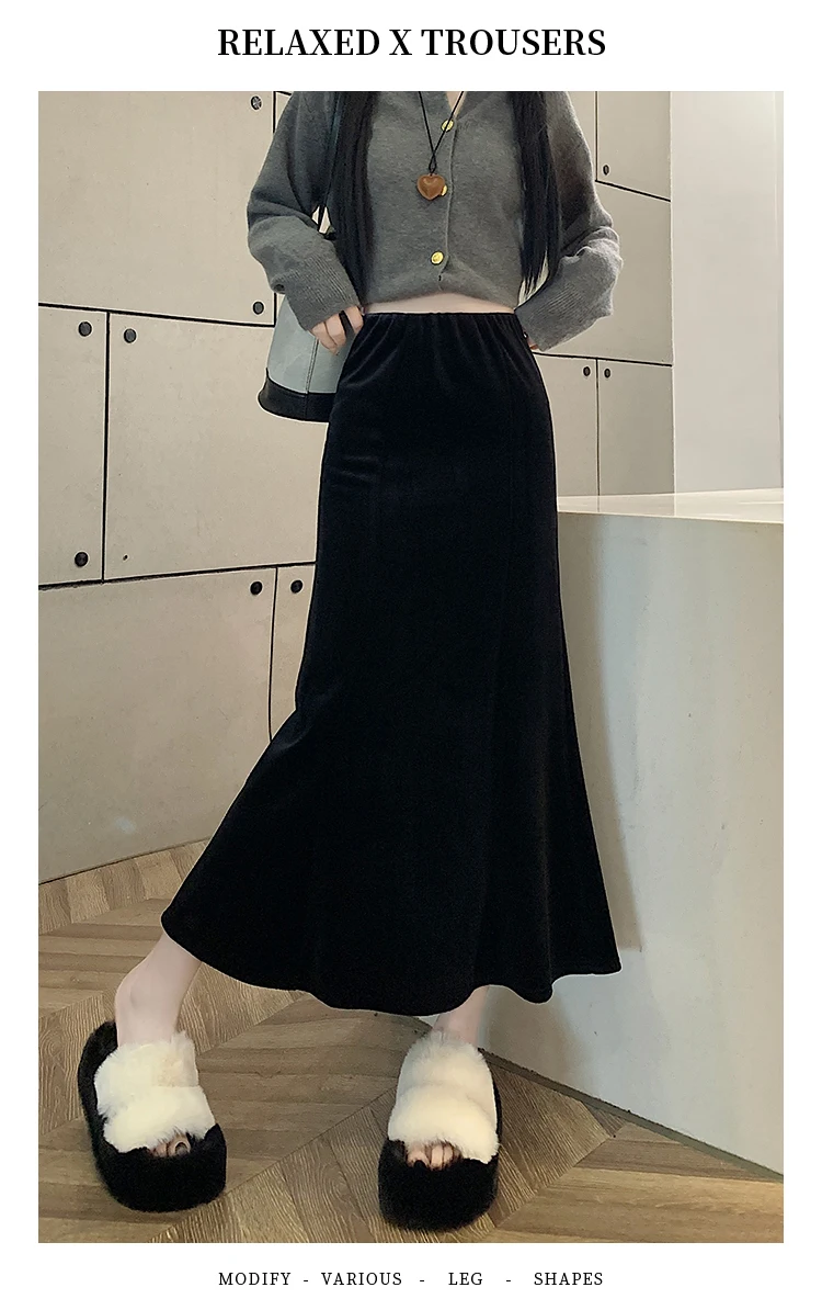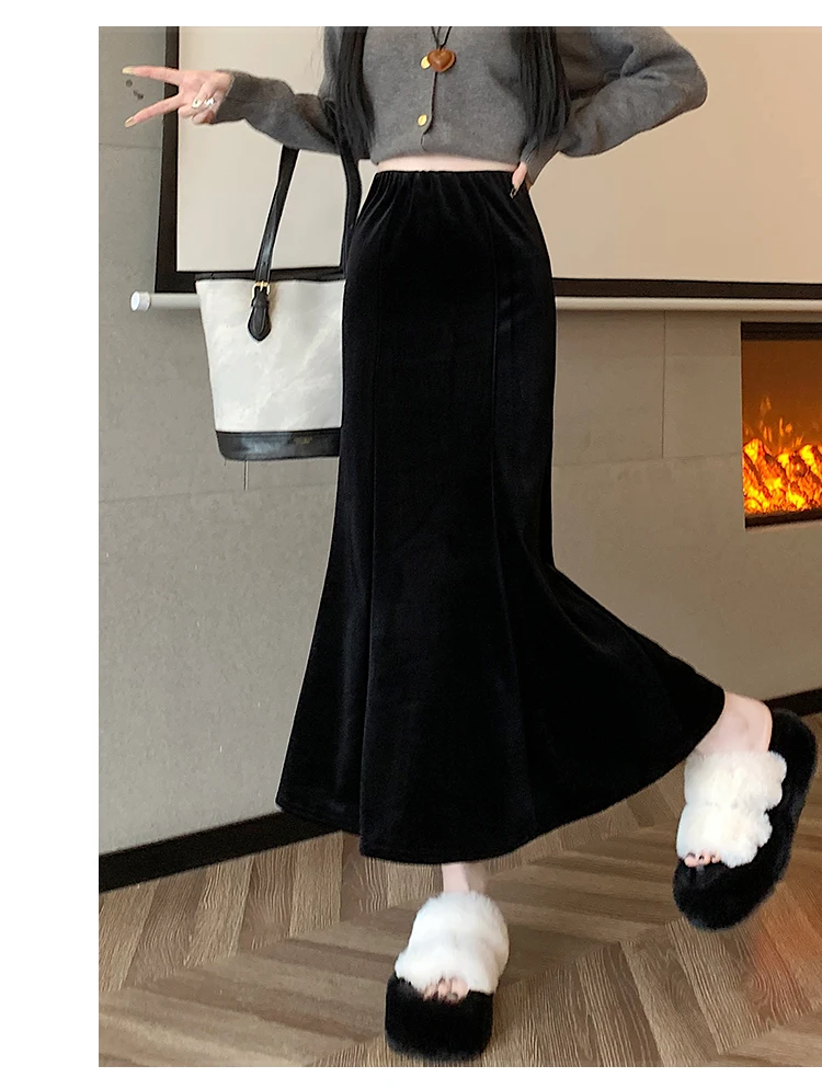 Elastic Velvet Long Black Skirts Women 2025 Casual Korean Fashion Y2k Clothes Mid Length Elegant High Waist Harajuku Maxi Skirt