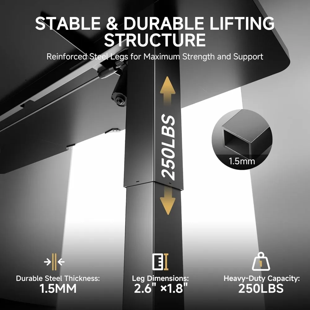 • ROCK-SOLID STABILITY: Built with a 1.5mm commercial-grade steel frame and reinforced connection area, this adjustable standing desk supports up to 250 lbs, making it ideal for heavy equipment and multiple monitors. The wide T-shaped legs and adjustable feet provide excellent stability, keeping the desk steady and secure, even at its highest position.