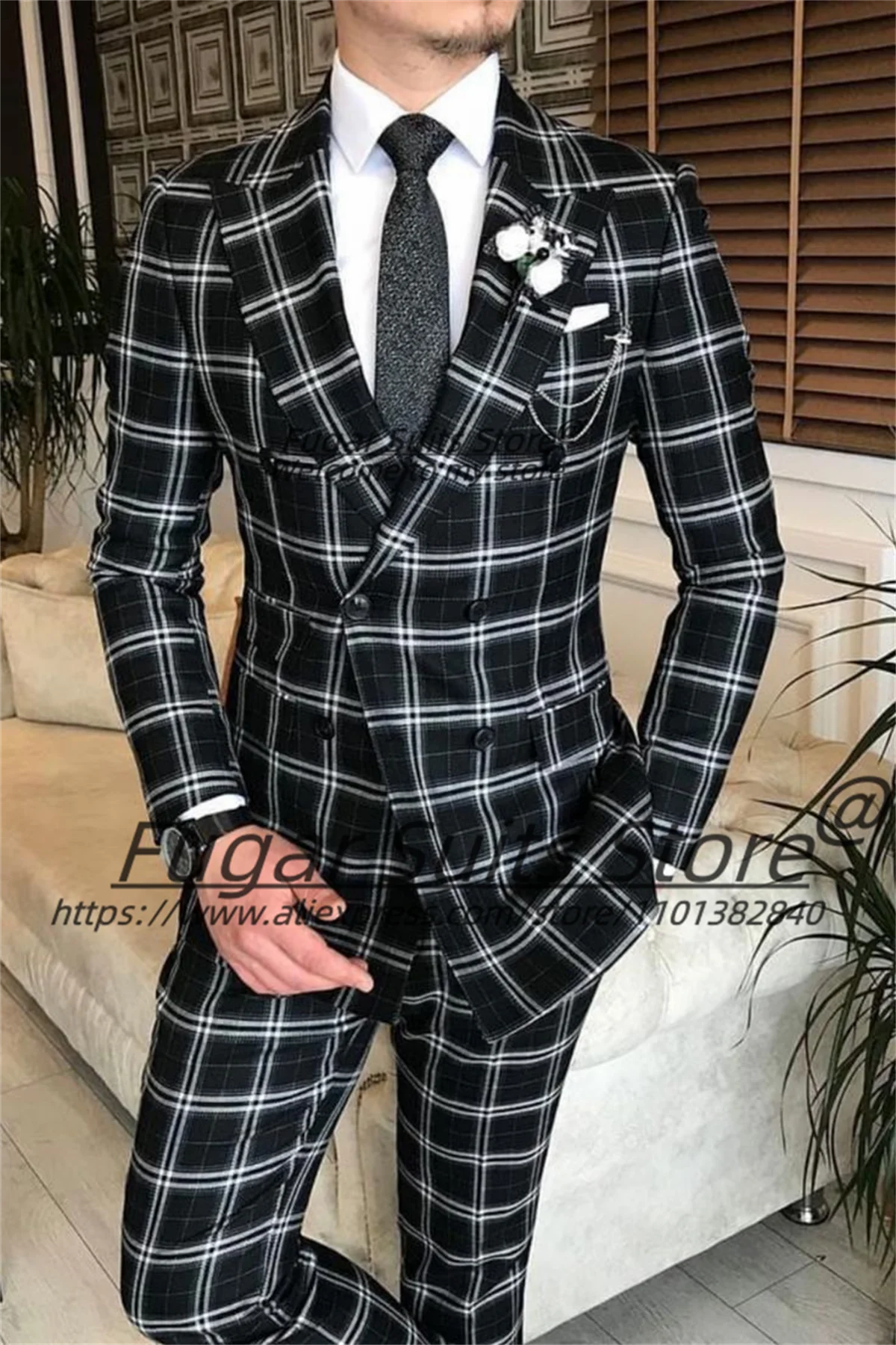 Elegant Black Plaid Men Suits Customized Slim Fit Double Breasted Groom Tuxedos 2 Pieces Sets Male Prom Blazers Costume Homme