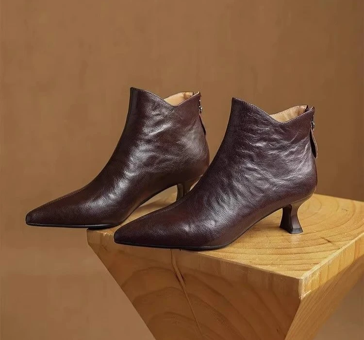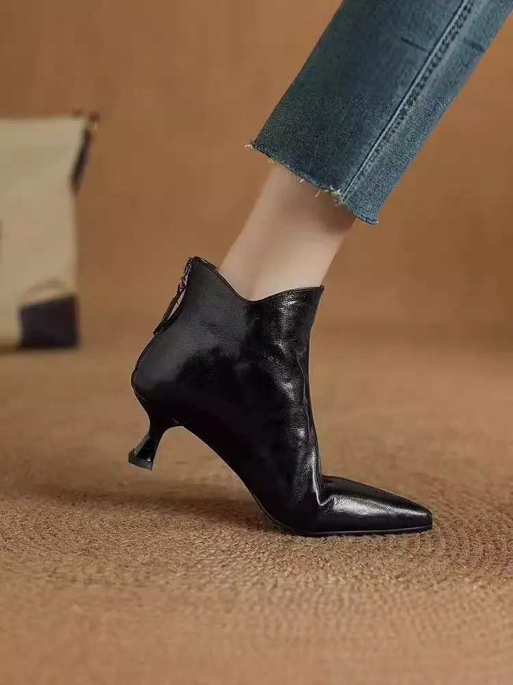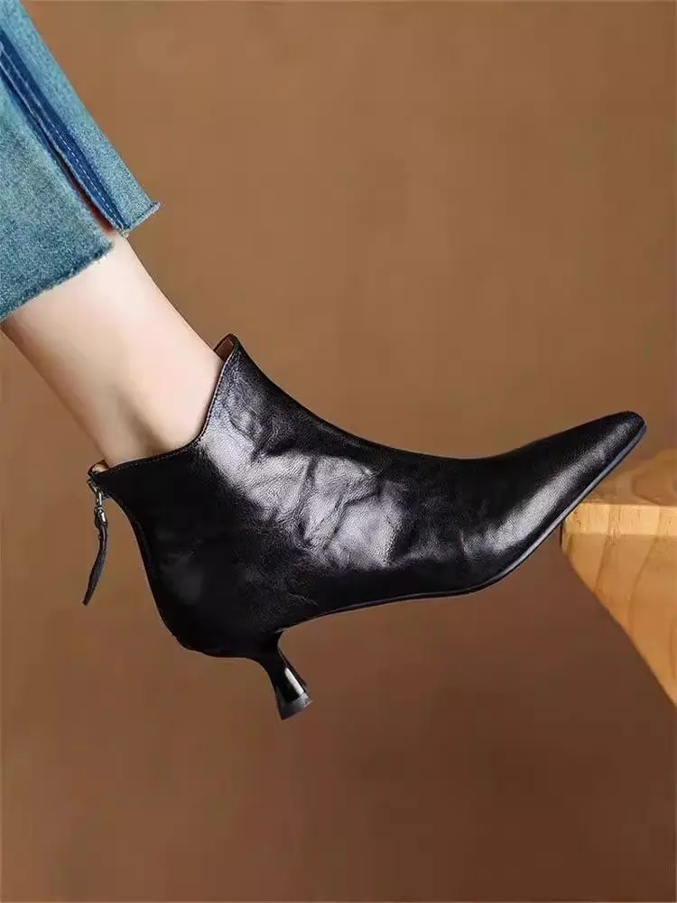 Elegant with Medium Heels Booties Autumn Winter Fleece-Lined Female Short Shoes Pointed Toe Leather Chelsea Women's Ankle Boots