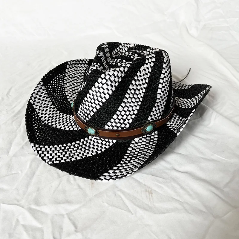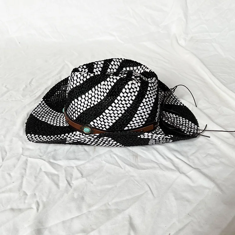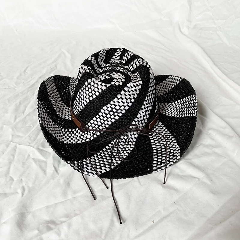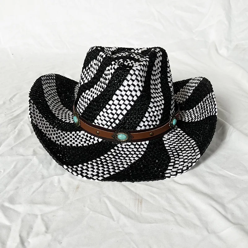 Ethnic Style Contrast Color Straw Cowboy Hat Mens Wide Brim Western Caps with Belt for Outdoor Party Vacation Sun Hats