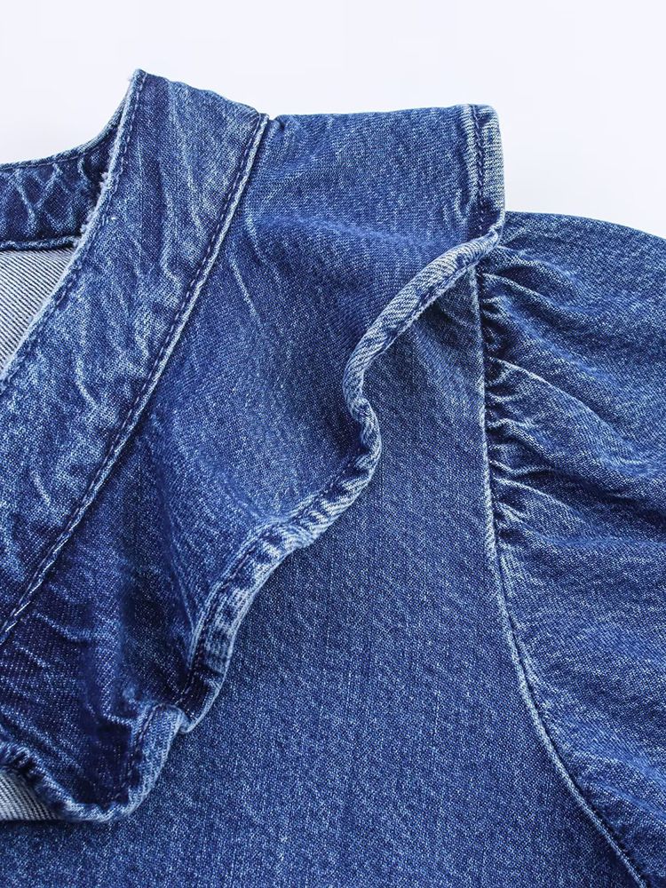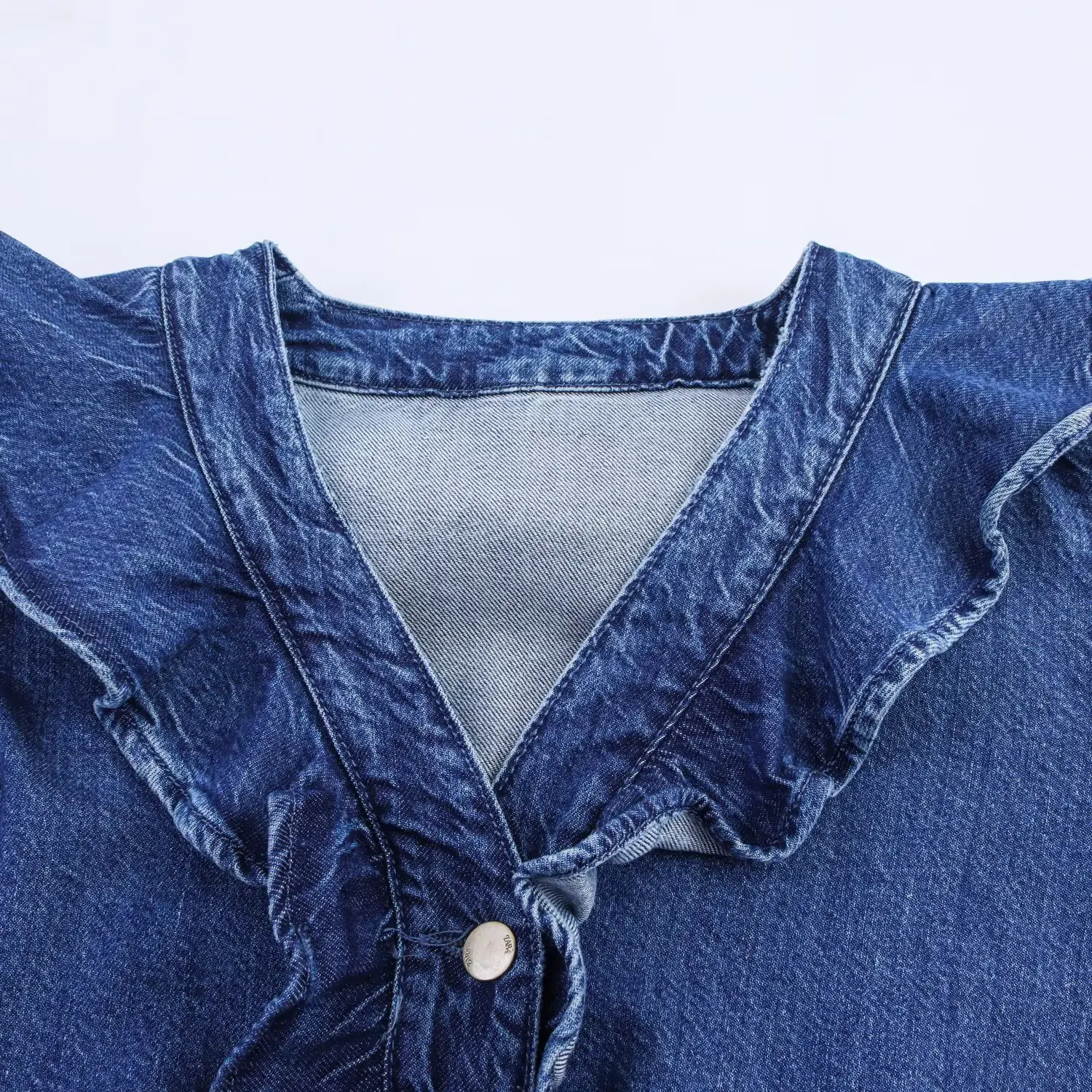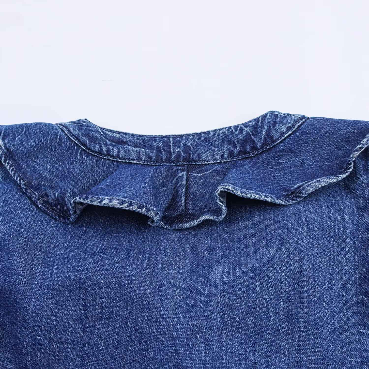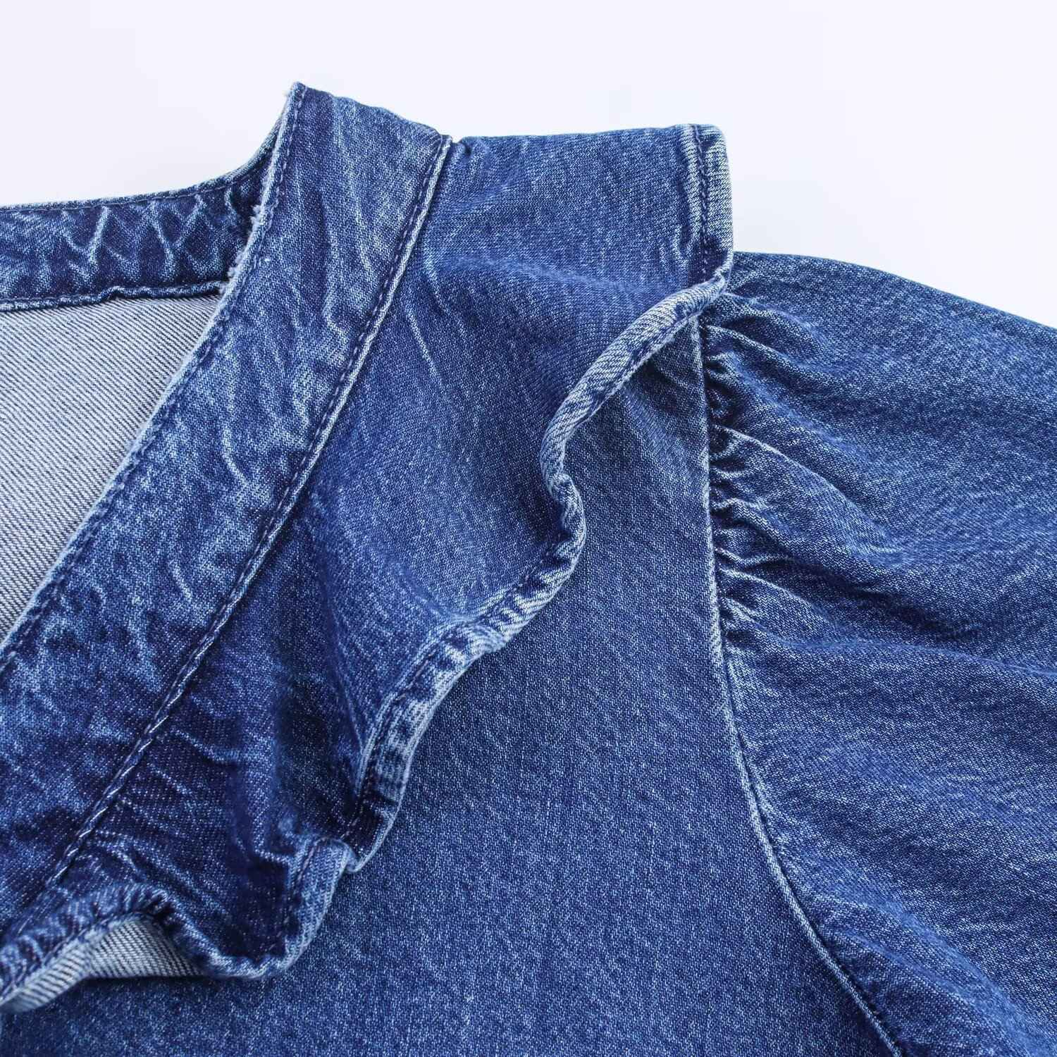 European style new women's fashion all-match temperament lotus leaf lace V-neck long-sleeved denim shirt