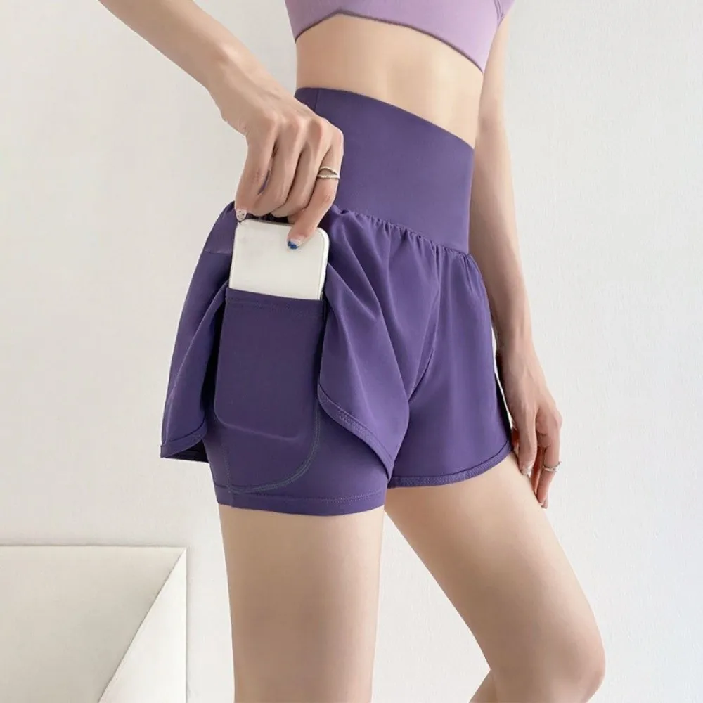 Packing:1pc yoga shorts Features: Breathable and quick-drying fabric, double-layer anti-glare design, sports storage pocket.
