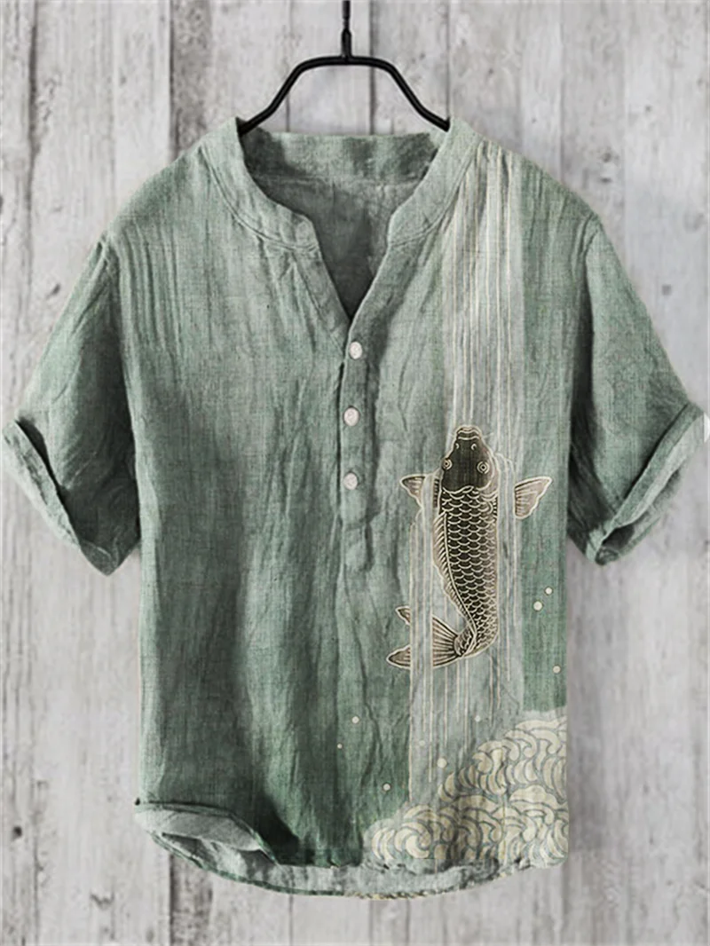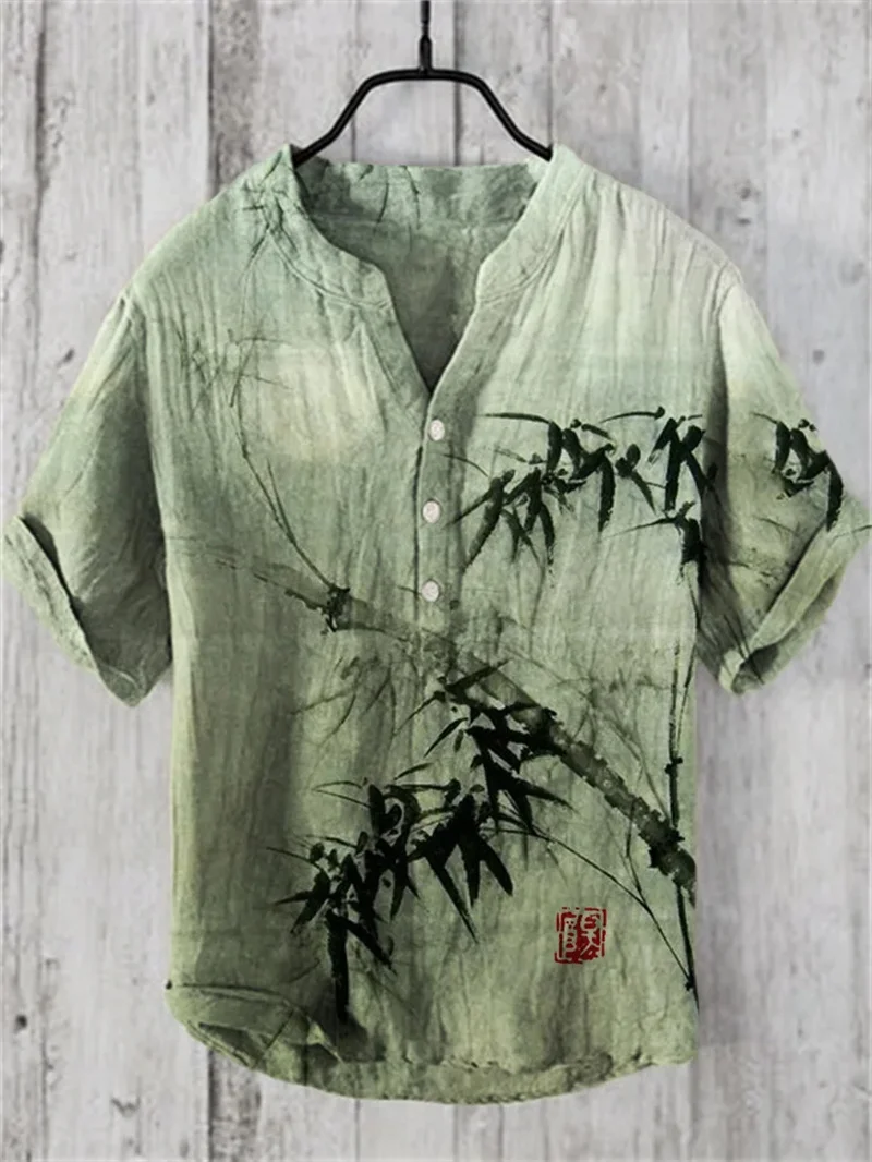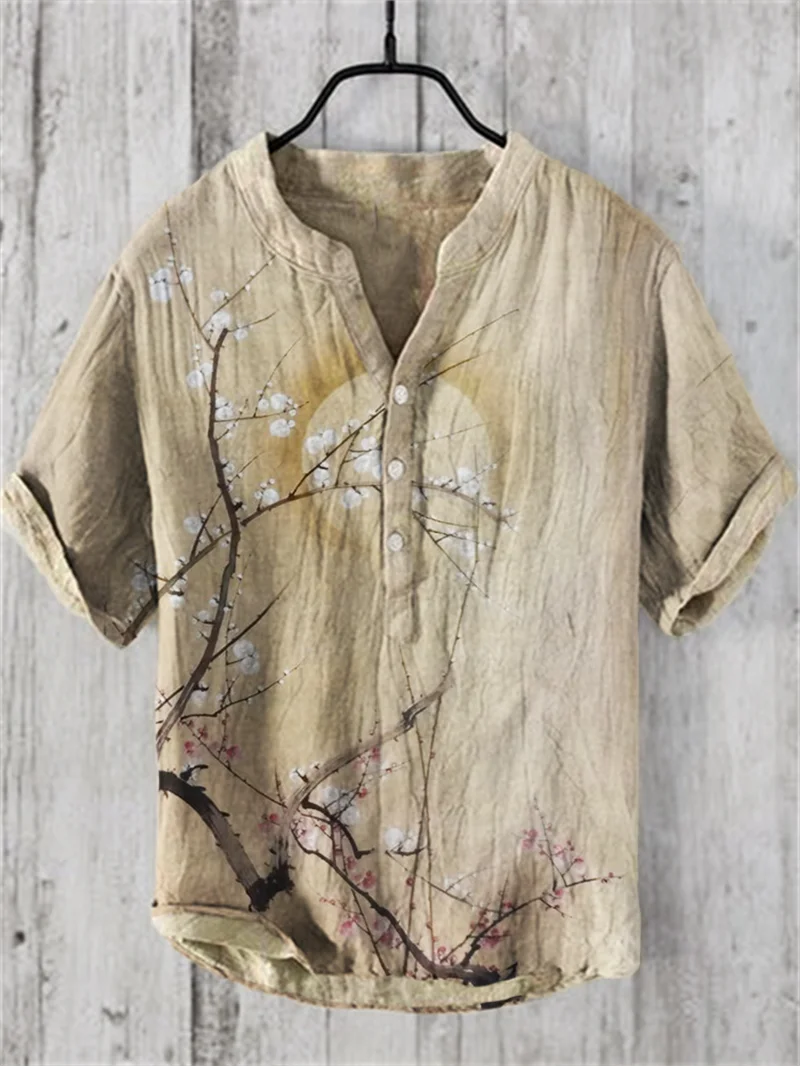 Fashion men's V-neck shirt T-shirt Hawaiian men's printed linen short-sleeved button-down shirt seaside holiday casual shirt